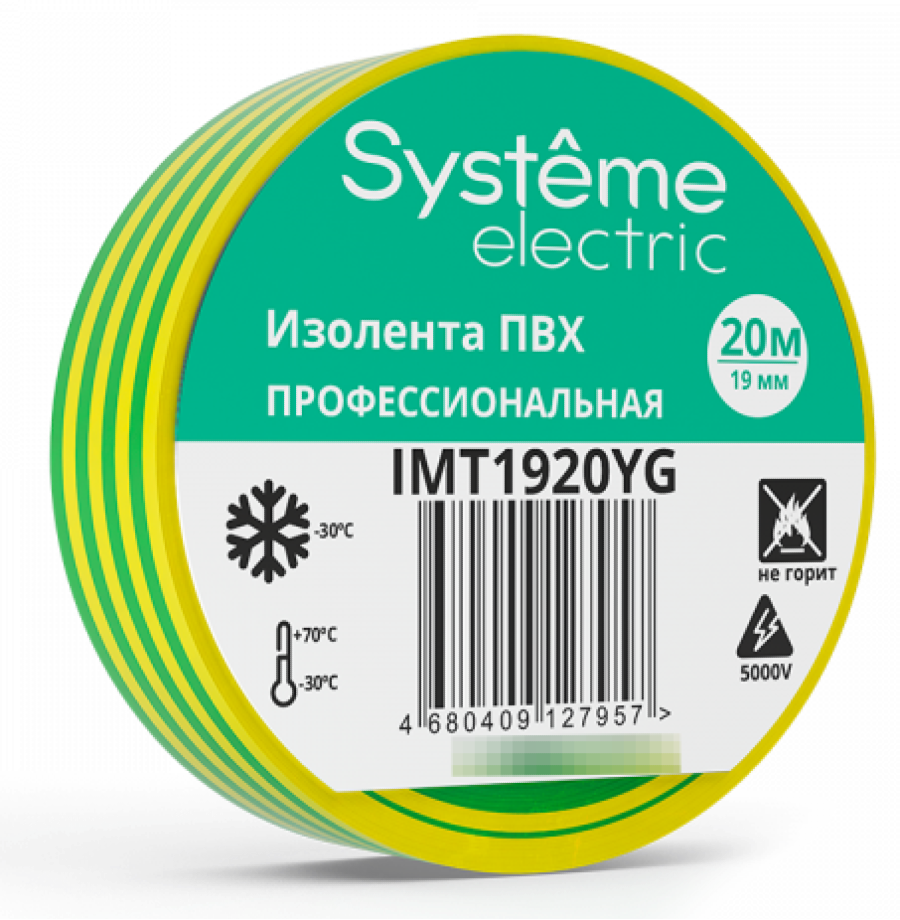 - Изолента ПВХ Systeme Electric профессиональная 0.13х19мм, желто-зеленая 20м, IMT1920YG - 1шт.