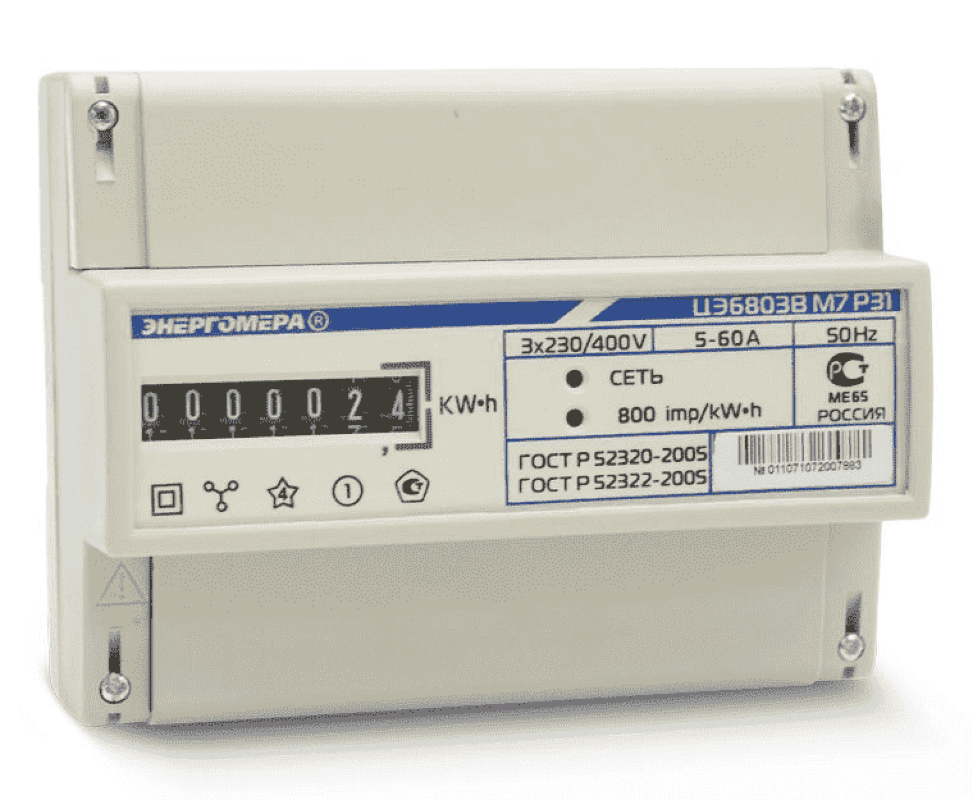 Счетчик электроэнергии Энергомера ЦЭ6803В/1 трехфазный однотарифный для четырехпроводных цепей, М7 Р31 DIN ОУ, 143×110×73мм, 230/400В, 5-60А, 160000ч / электросчетчик