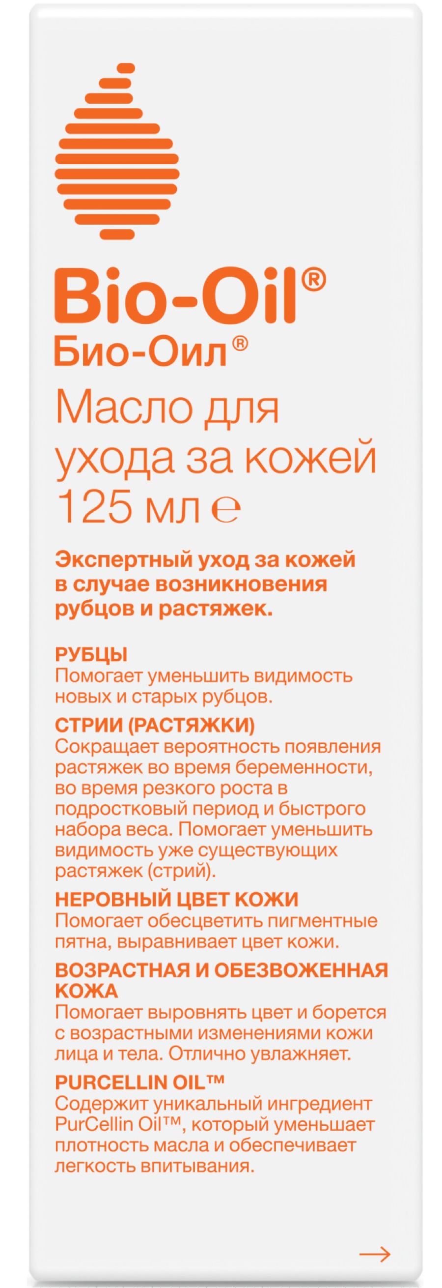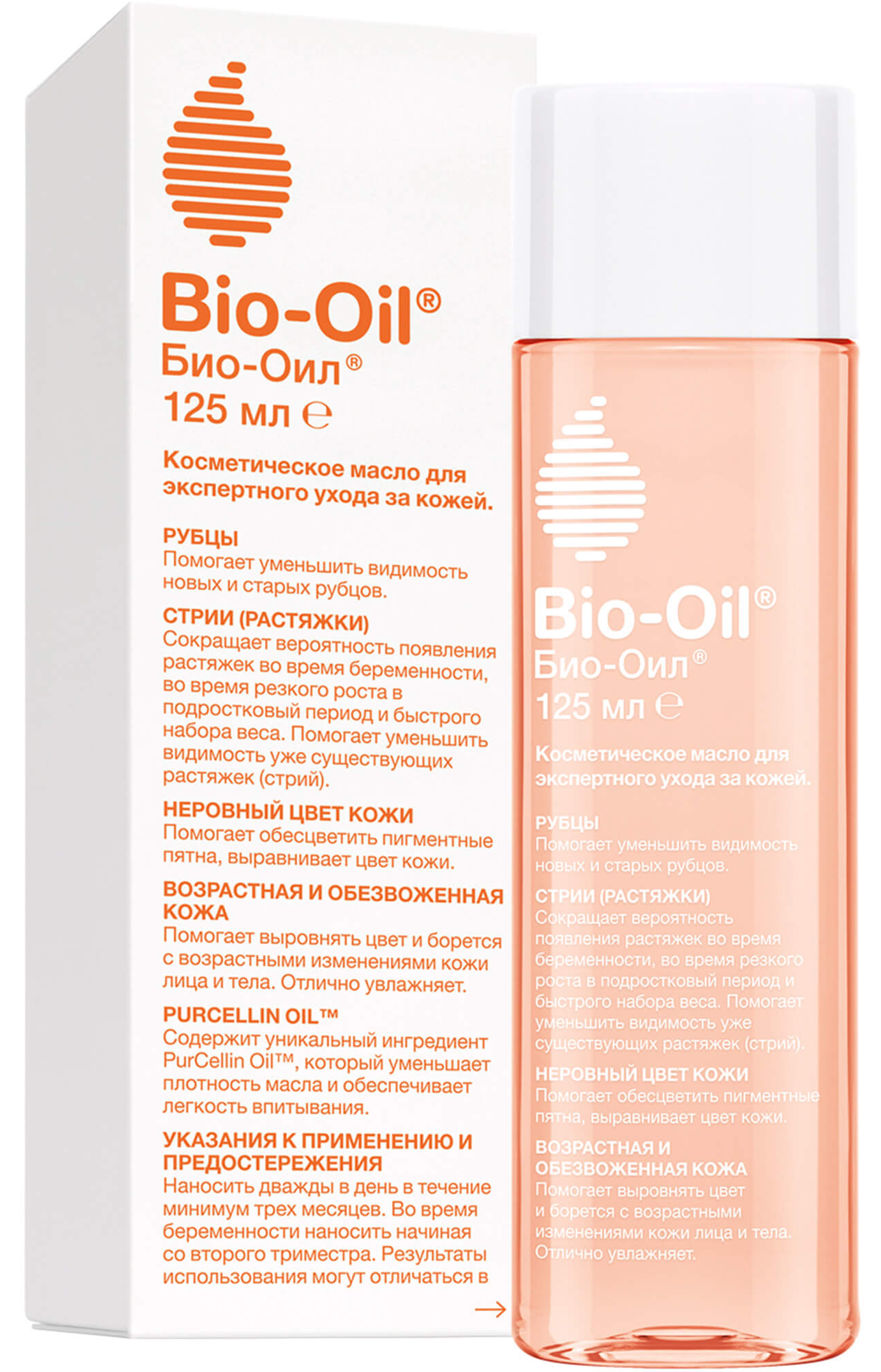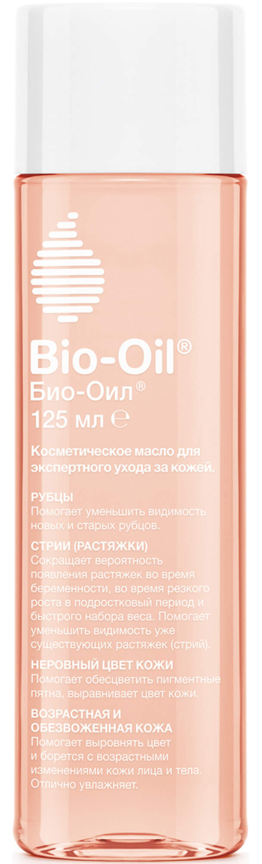 Продукт реализуется в индивидуальной упаковке в емкости на 125 мл. Масло косметическое Bio-Oil изготавливается на основе 100% натуральных и безопасных компонентов. Для применения необходимо нанести небольшое количество на кончики пальцев и растереть на проблемном месте, слегка массируя.