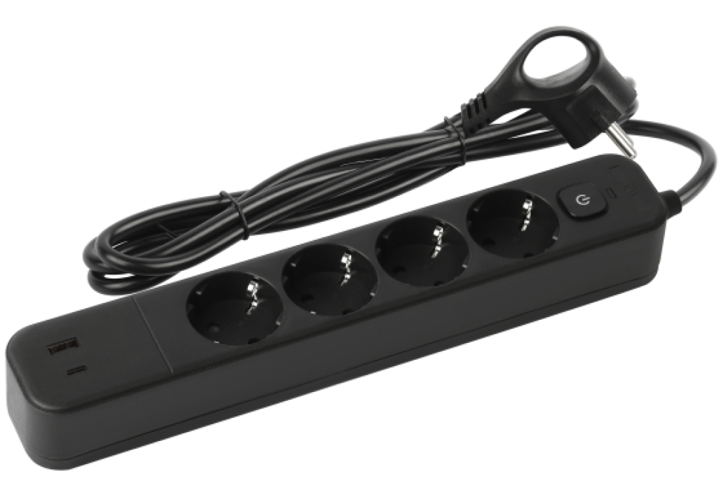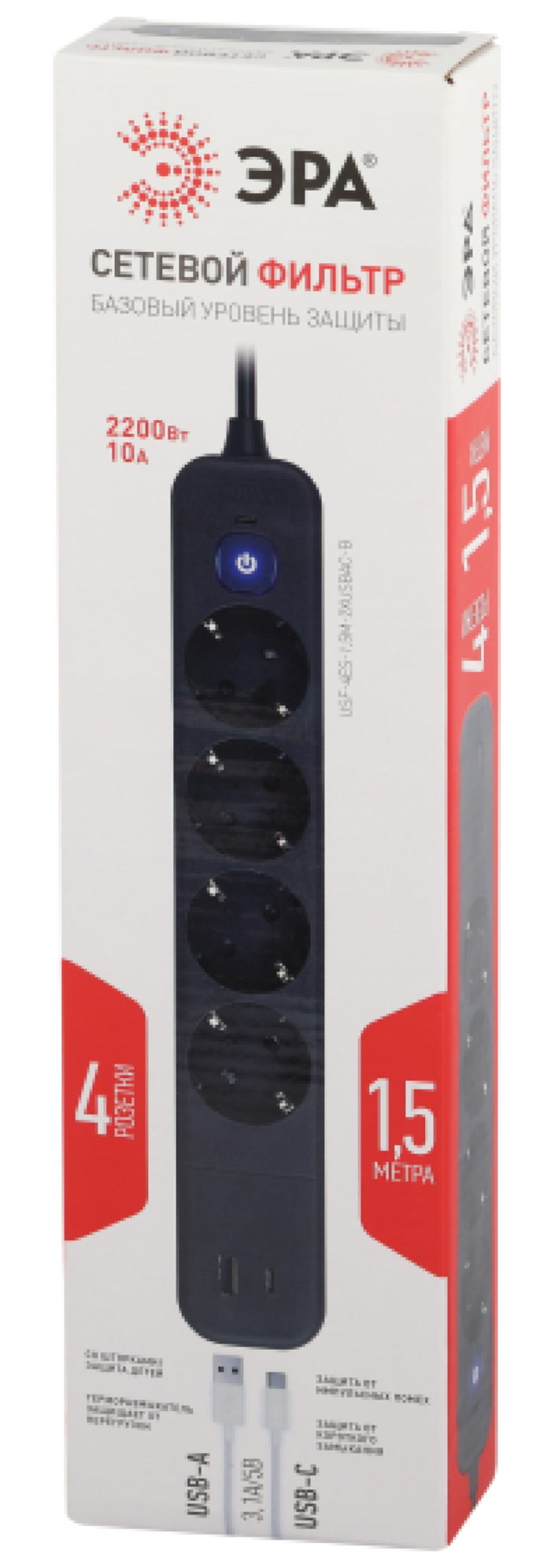 - Сетевой фильтр ЭРА USF-4es-1.5m-2xUSBAC-B с базовой защитой с заземлением и выключателем, 10А 3x0.75мм2, 1.5 метра 5 гнезд/2xUSBA+C черный, Б0019738 - 1шт.