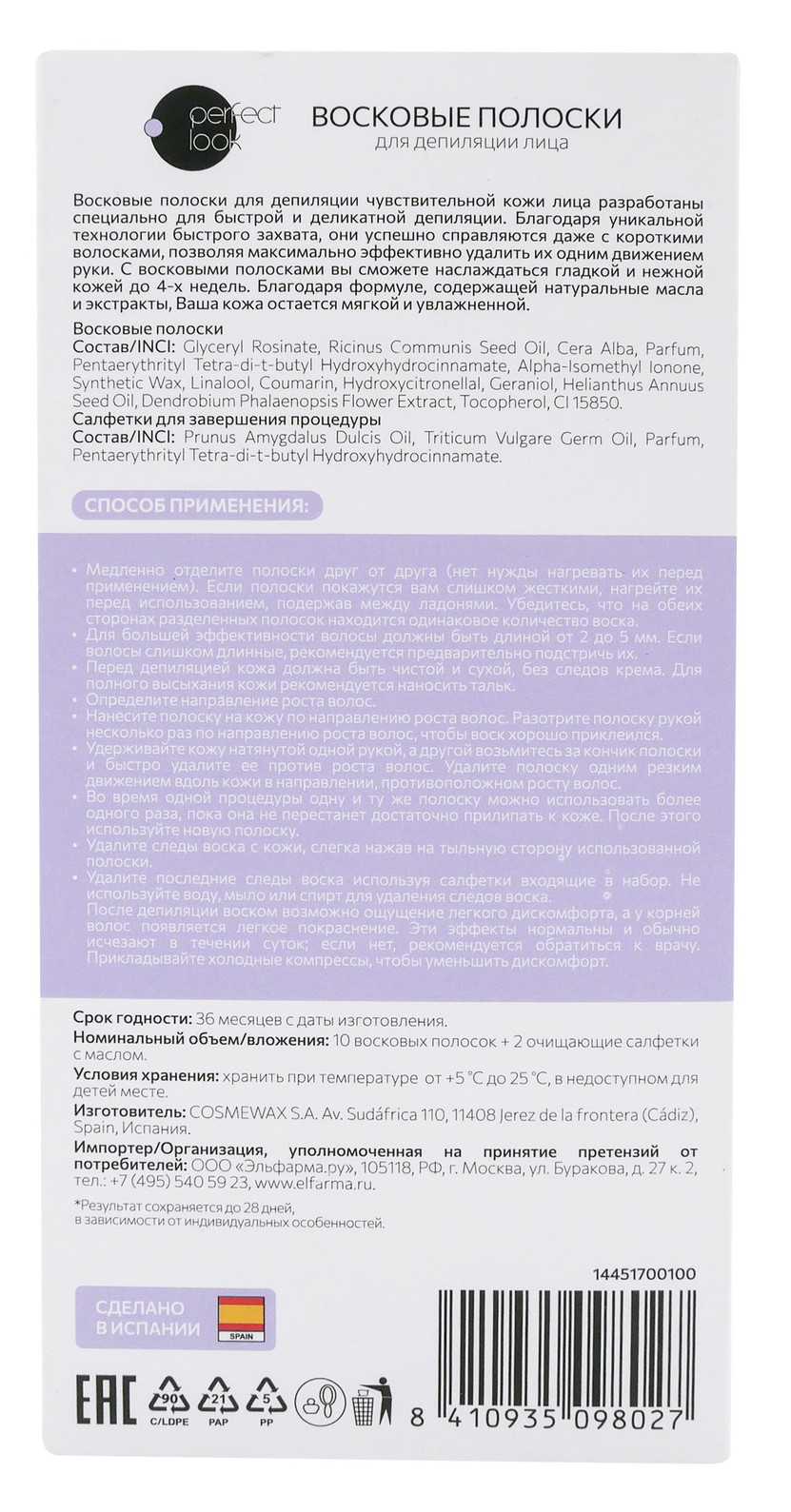 Восковые полоски для депиляции Perfect Look c натуральными маслами идеально подходят для депиляции лица.