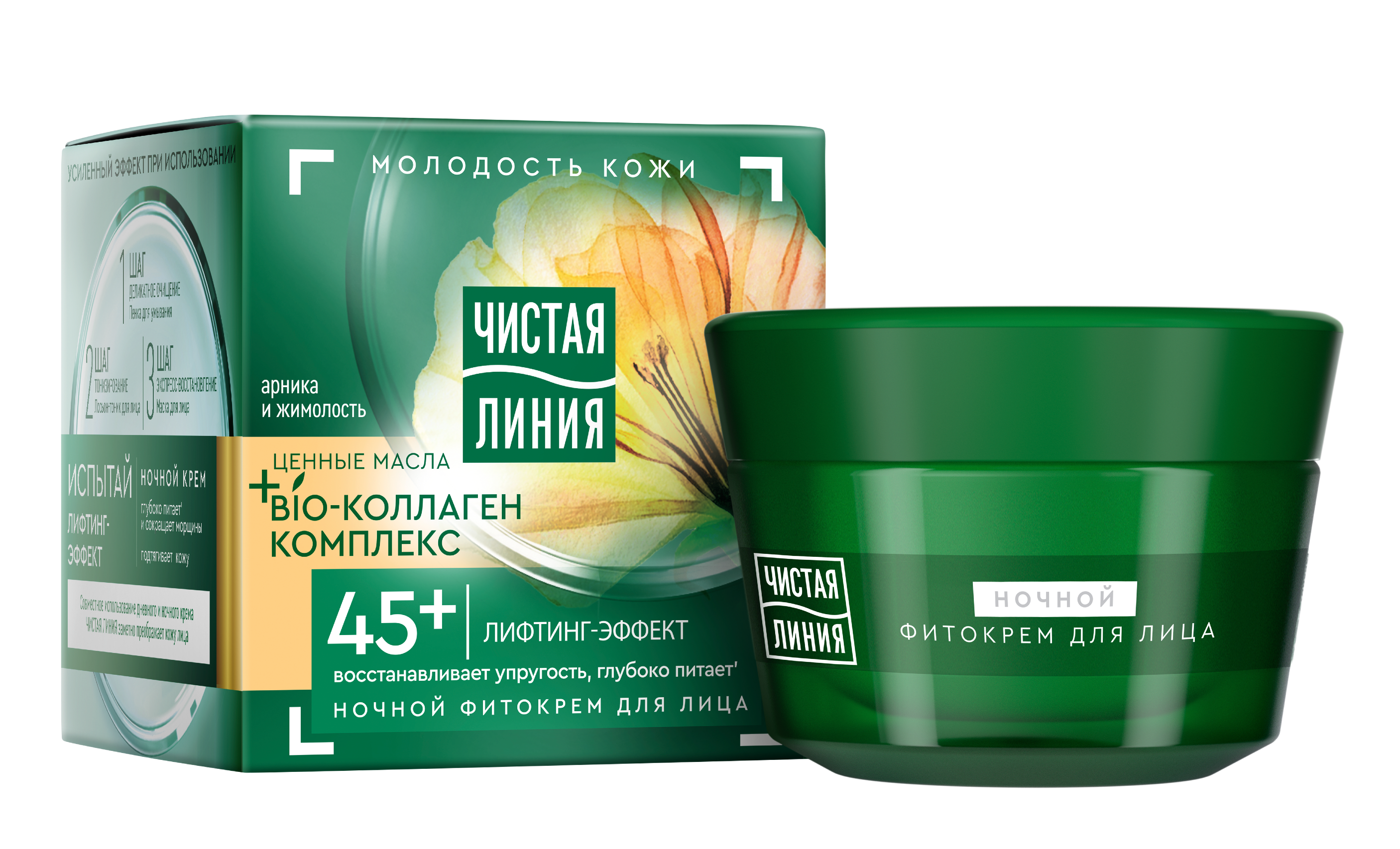 Чистая Линия Bio-коллаген комплекс Крем для лица ночной 45+ лифтинг-эффект, арника и жимолость, восстановление и питание 45мл