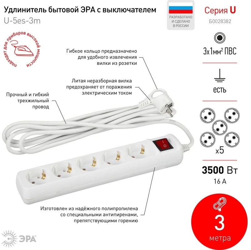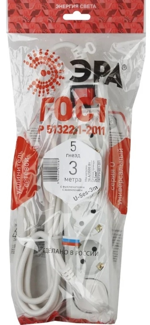 Удлинитель ЭРА U-5es-3m Россия с заземлением, 3x1мм2, 16A, ПВС, с выкл, 5гн, 3м Б0028382 станет Вашим надежным помощником, если Ваши любимые электроприборы находятся далеко от розеток. Провод в удлинителях Эра сделан из 100% меди, что делает его абсолютно пожаробезопасным. Корпус выполнен из ударопрочного и негорючего пластика (полипропилен). У вилки есть кольцо для удобного извлечения из розетки. Модель удлинителя на 16А позволяет подключить мощные бытовые приборы общей нагрузкой до 3500Вт. Не бойтесь включить чайник, обогреватель, микроволновку или другие электроприборы. Толстый провод удлинителя Эра гарантирует полную безопасность. Дизайн удлинителя разработан в России командой Эра Style.