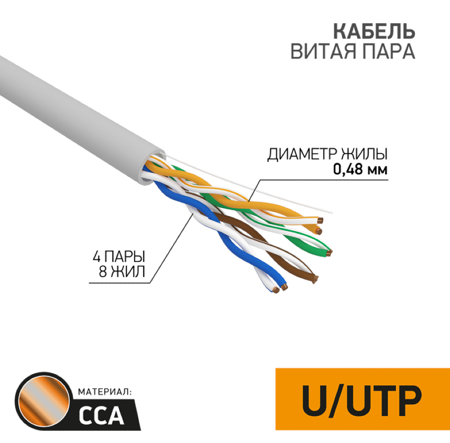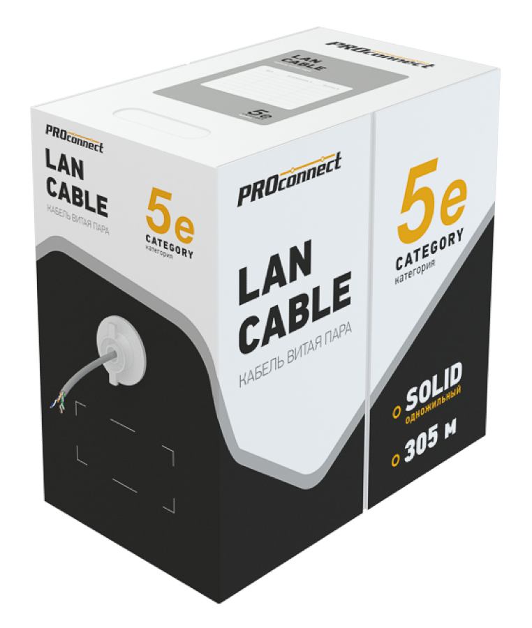 Кабель информационный PROconnect / Проконнект Indoor solid 24AWG 4PR, витая пара, омедненный CCA ПВХ серый, U/UTP, cat5e, 4 пары, 5.1мм, 305м / электрика