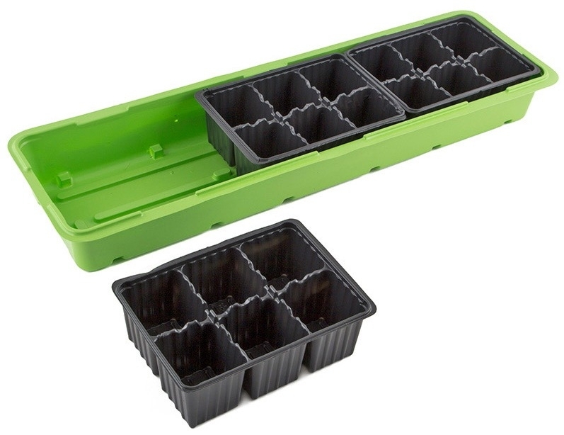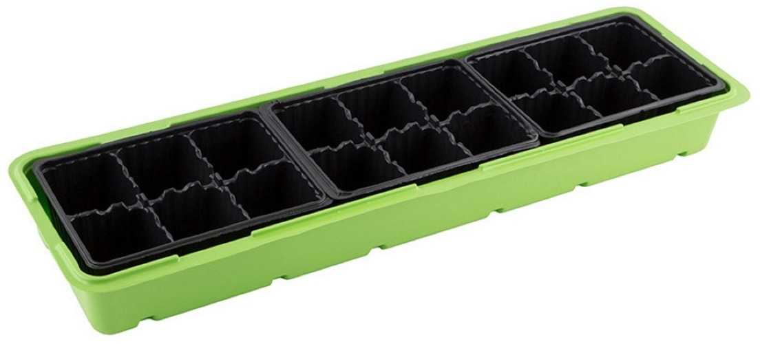 Парник реализуется в индивидуальной упаковке. Количество ячеек — 18 шт. Материал — полистирол. Цвет — зеленый/черный. Размер — 57х18х6 см.