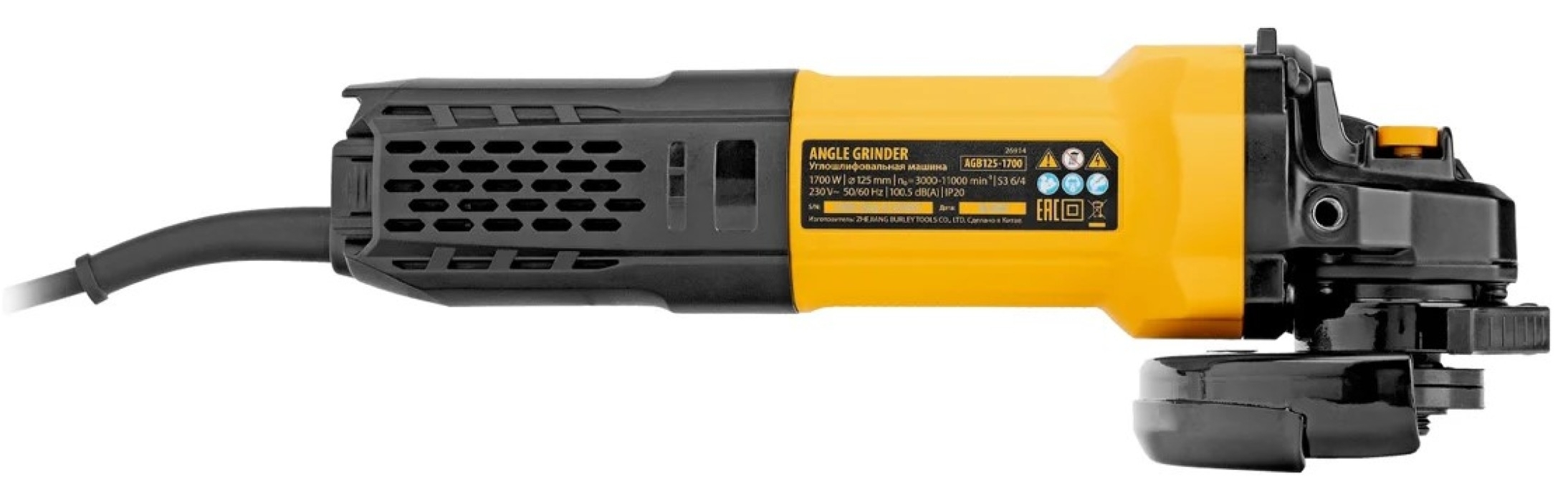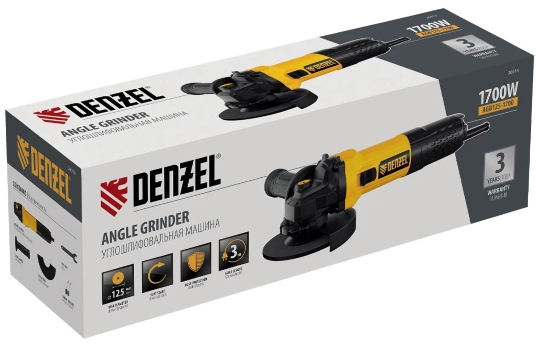 - Шлифмашина угловая Denzel AGB125-1700 сетевая, посадочный диаметр 20мм, диск 125мм, 11000об/мин, 1700Вт - 1шт.