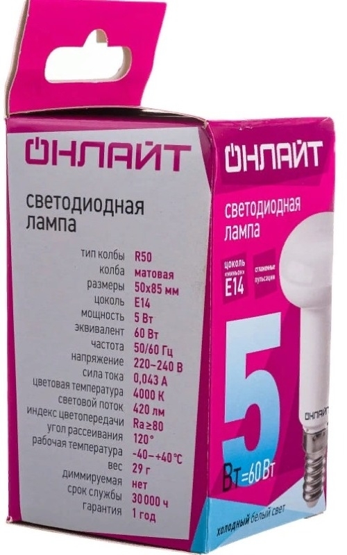 Лампочка светодиодная ОНЛАЙТ рефлектор, Е14, 4000К, 420Лм, теплый белый, 220В, 5Вт / освещение