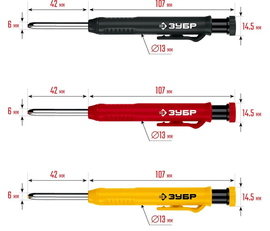 Красный/желтый/черный цвет строительного карандаша Зубр и длина 149 мм делают инструмент хорошо заметным и функциональным. Линии на абразивных материалах выполняются быстро и сохраняют высокую точность.