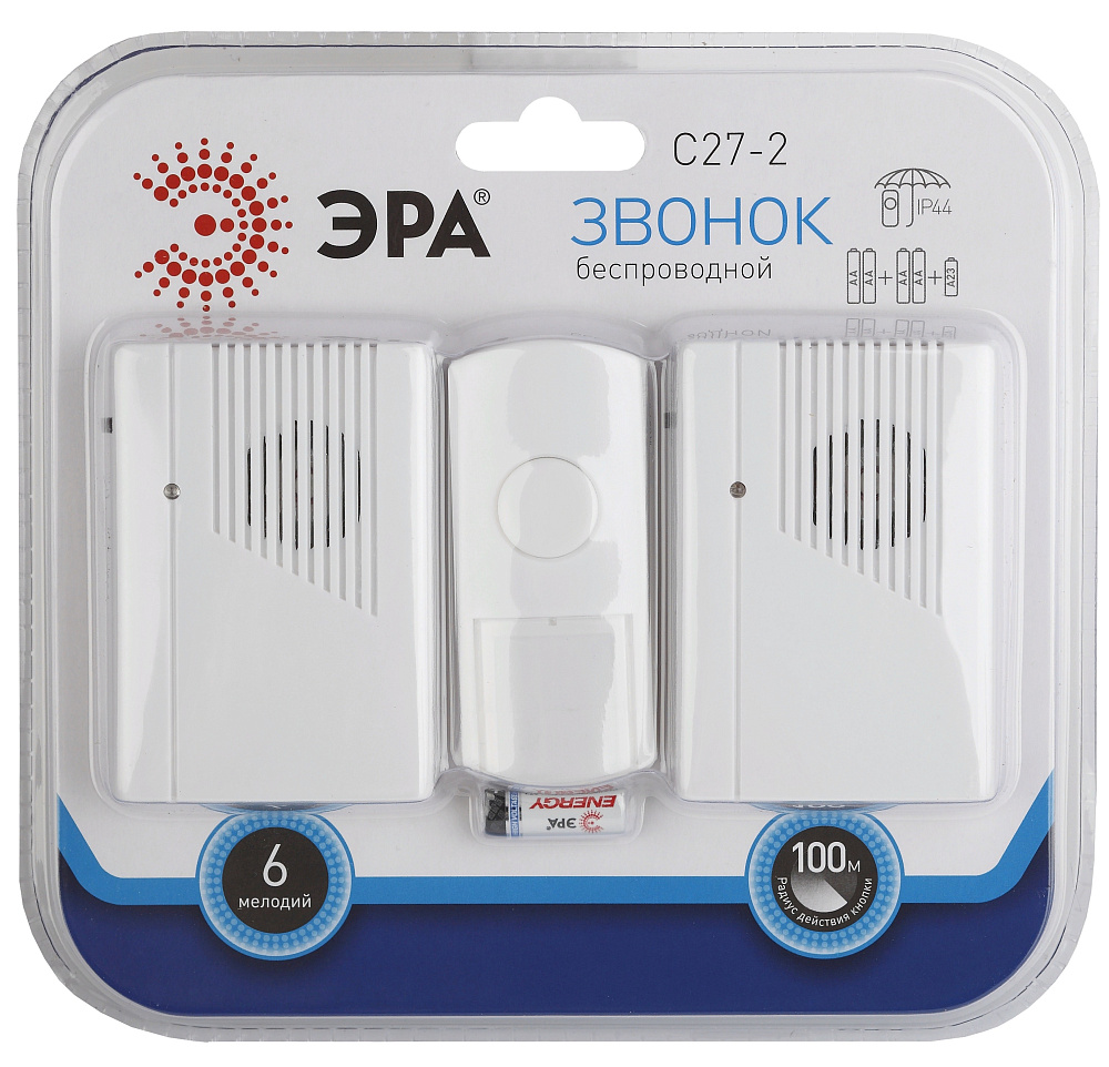 - Звонок дверной ЭРА C27-2 беспроводной, 2 динамика, 6 мелодий, белый, IP44 - 1шт.
