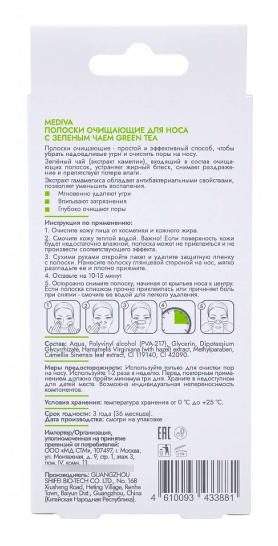 Полоски для носа Mediva реализуются в индивидуальной упаковке. Количество — 6 шт. В их состав входят следующие компоненты: Aqua, Polyvinyl alcohol (PVA-217), Glycerin, Dipotassium Glycyrrhizate, Hamamelis Virginiana (with hazel) extract, Methylparaben, Camellia Sinensis leaf extract, CI 119140, CI 42090.