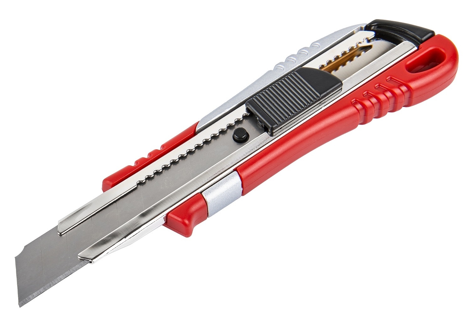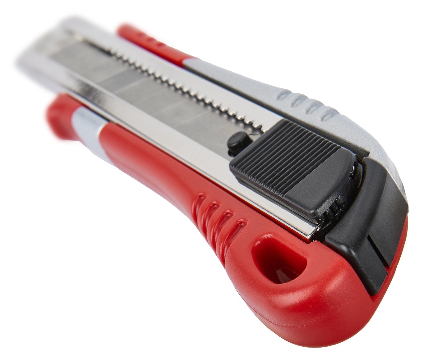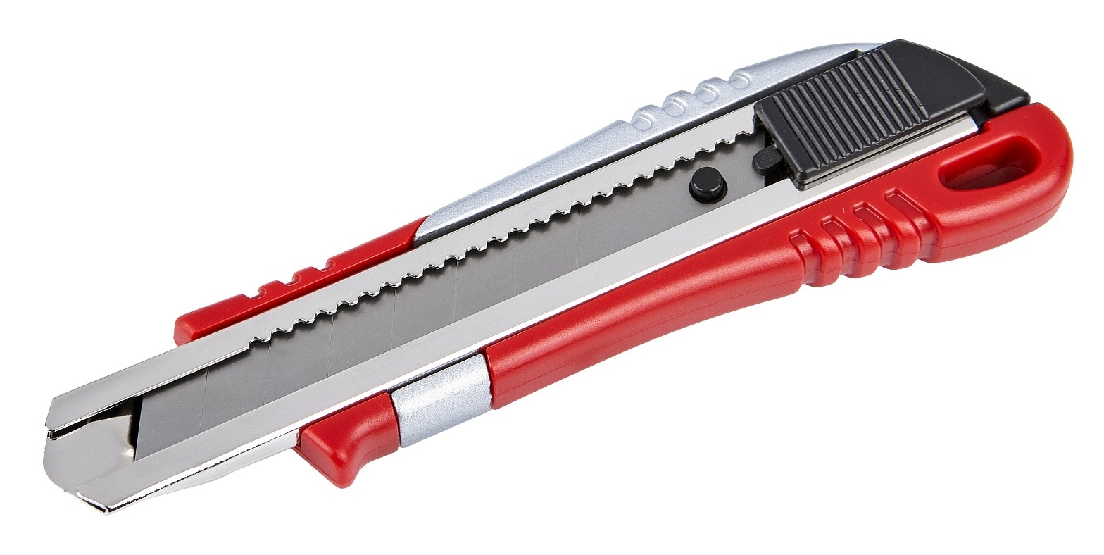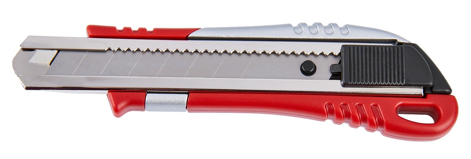 Строительный нож с шириной лезвия 18 мм, автофиксатором и рукояткой из цинкового сплава со вставкой из ABS-пластика. Колпачок на ручке имеет прорезь для отламывания сегментов лезвия.