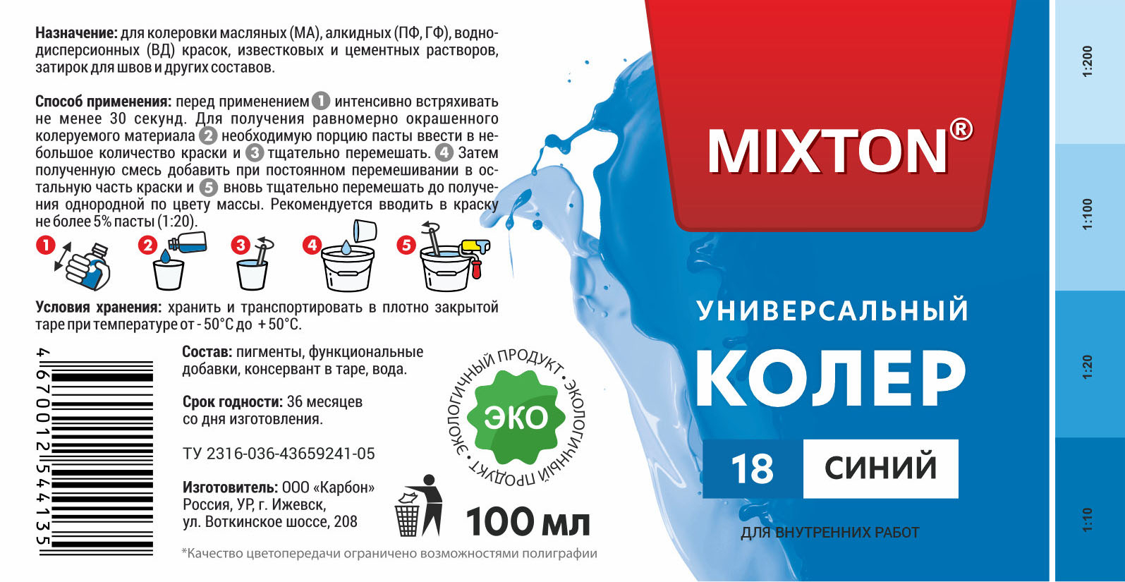 Колеровочные пасты МИКСТОН используются для водо-эмульсионных красок, эмалей, а также различных смесей, всевозможных растворов и иных составов. Количество колера напрямую зависит от того, насколько насыщенным должен быть оттенок. Применение — Нужную часть колера для краски необходимо тщательно смешать с малым количеством колируемой краски. Не переставая помешивать добавить получившуюся смесь в общую массу краски и тщательно перемешать, чтобы получился ровный цвет.