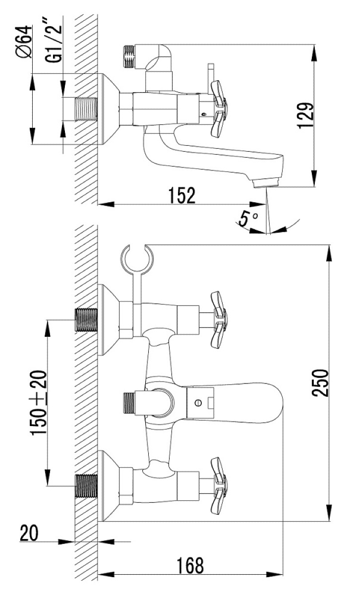 - Смеситель Lemark Partner для ванны, двуручковый, из латуни, цвет хром, излив 152мм - 1шт.