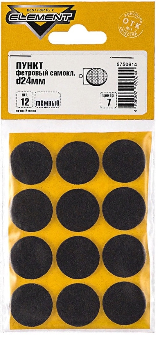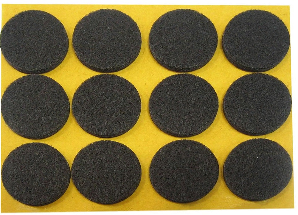Пункты-самоклейки предназначены для закрепления на ножках мебели. Благодаря им можно защитить напольное покрытие (линолеум, паркет и ламинат, мрамор, натуральный камень) от повреждений, сохранив его целостность. Также пункты используются для того, чтобы приглушить звук во время перестановки мебели. Материал изготовления фетр. Цвет темный.