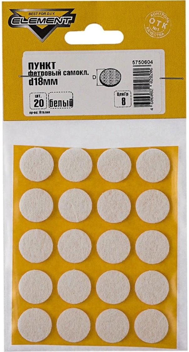 Пункты-самоклейки предназначены для закрепления на ножках мебели. Благодаря им можно защитить напольное покрытие (линолеум, паркет и ламинат, мрамор, натуральный камень) от повреждений, сохранив его целостность. Также пункты используются для того, чтобы приглушить звук во время перестановки мебели. Материал изготовления фетр. Цвет белый.