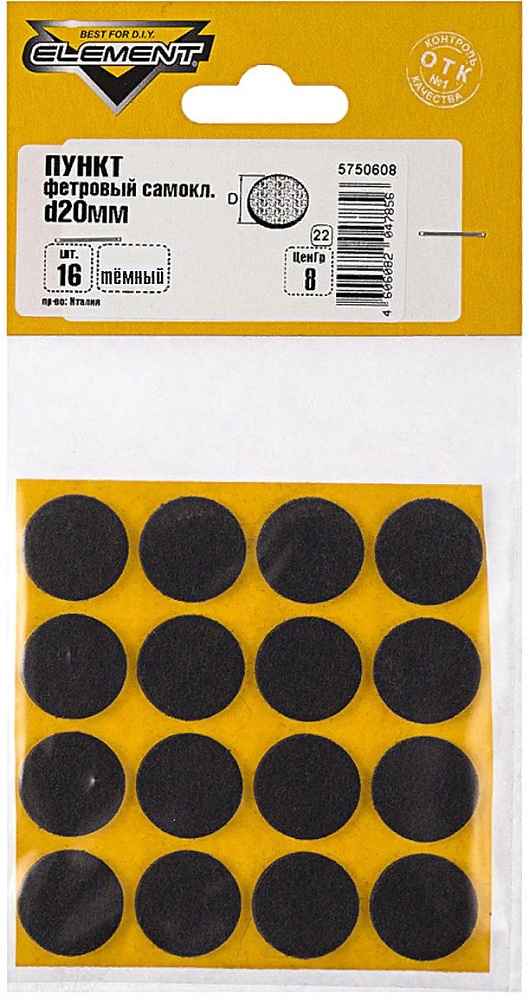 Пункты-самоклейки предназначены для закрепления на ножках мебели. Благодаря им можно защитить напольное покрытие (линолеум, паркет и ламинат, мрамор, натуральный камень) от повреждений, сохранив его целостность. Также пункты используются для того, чтобы приглушить звук во время перестановки мебели. Материал изготовления фетр. Цвет темный.