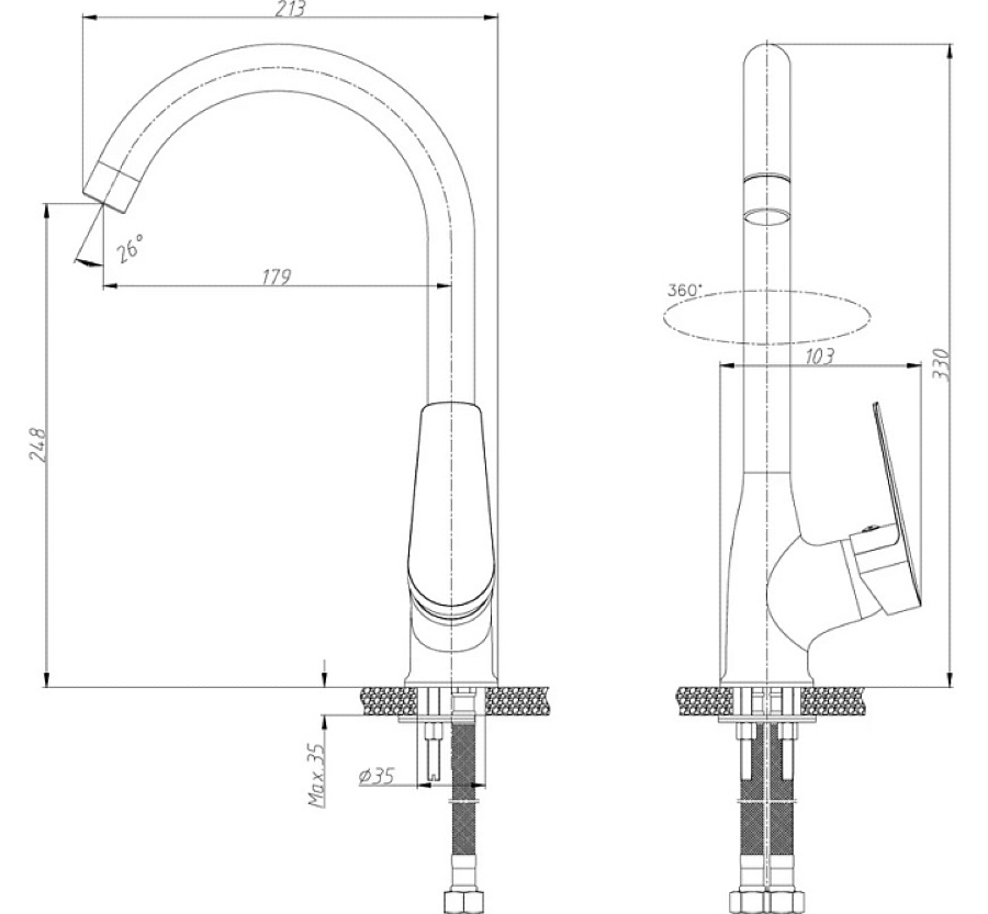 Смеситель для кухни Rossinka реализуется в индивидуальной упаковке. Выполнен из латуни. Цвет — хром. Высота изделия — 248 мм. Длина излива — 179 мм. Диаметр отверстия в раковине — 35 мм. Размер крепления — G½.