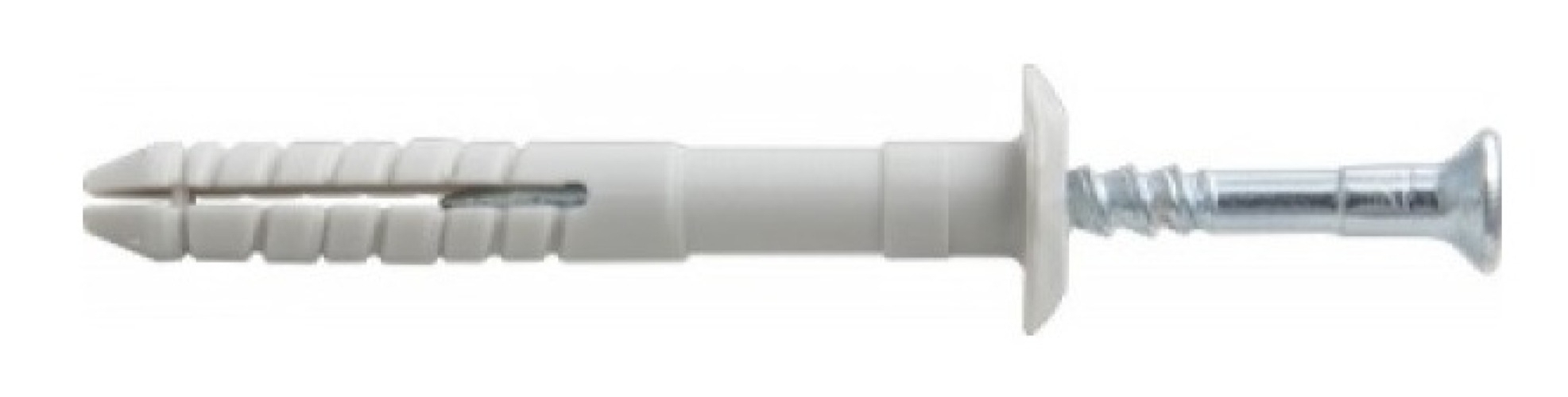 Материалы: распорный дюбель - полиамид (нейлон), гвоздь - оцинкованная сталь. Особенности конструкции: система состоит из распорного дюбеля и гвоздя с винтовой нарезкой. Дюбель имеет предохранитель, препятствующий преждевременному распиранию при забивании гвоздя, а также обратную резьбу в хвостовой части, не позволяющую вывинчиваться дюбелю вместе с гвоздем. Стопорный бортик дюбеля предотвращает его проваливание в отверстие. Распорная часть дюбеля состоит из двух сегментов. На шляпке гвоздя крестовой шлиц, позволяющий осуществлять демонтаж или юстировку конструкции. Принцип работы: при забивании гвоздя дюбель равномерно распирается в стенках отверстия.