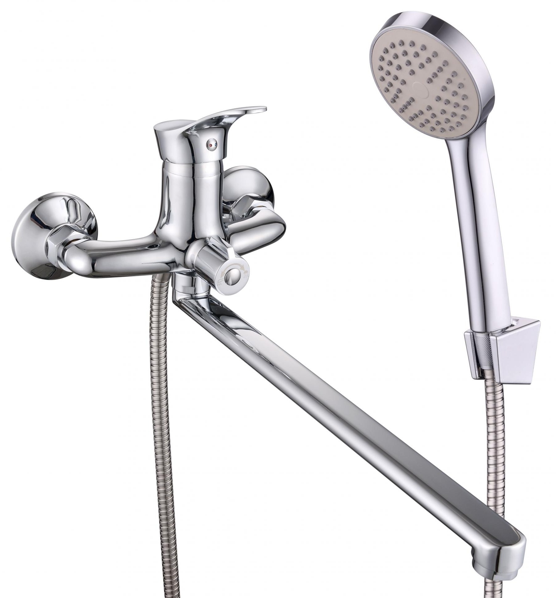 Однорычажный смеситель для ванной BBI-3021-35L-31 с длинным изливом и керамическим картриджем 35 мм из серии 031 D35. Излив L-плоский, 35 см, с аэратором. Цвет хром. Материал корпуса: латунь, покрытие: хром. В комплекте душевая лейка, держатель лейки, шланг.
