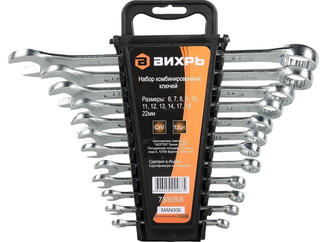 Набор комбинированных ключей Вихрь состоит из 12 штук с размерами от 6 до 22 мм: 6, 7, 8, 9, 10, 11, 12, 13, 14, 17, 19, 22.