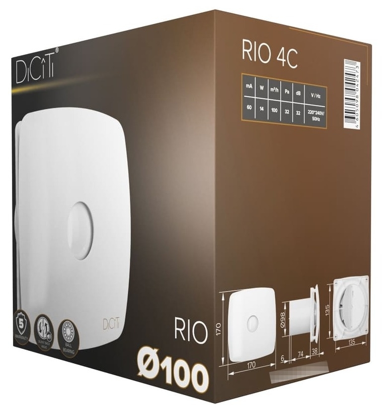 Вентилятор Era Rio 4C представляет собой вытяжной вентилятор для удаления воздуха из туалета, ванной или кухни. Данная серия оборудована малошумным обратным клапаном, который перекрывает вытяжной канал при выключении вентилятора. Устанавливается в существующий вытяжной канал квартиры патрубком внутрь и крепится к поверхности стены. Допускается монтаж в потолок и соединение патрубка вентилятора через небольшой участок воздуховода (до 0,5 метра). Оригинальная лицевая панель, удаление воздуха происходит через щель между панелью и корпусом вентилятора. Встроенный обратный клапан. Защита от перегрева. Корпус и решетка изготовлены из АБС-пластика. Вентилятор можно использовать для вентиляции постоянно или включать периодически. Простое обслуживание (состоит в периодической чистке крыльчатки и проверке электрических соединений). Класс защиты IP24, что позволяет использовать изделие во влажном помещении. Гарантия 5 лет.