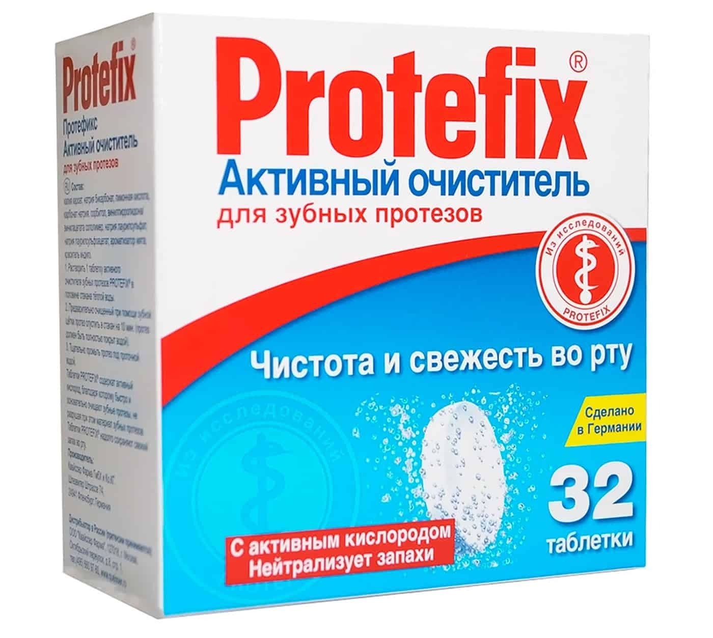 В течение дня в полости рта скапливаются остатки пищи, что обуславливает необходимость тщательной гигиены полости рта. Зубные протезы отрицательно влияют на состояние микрофлоры полости рта и нарушают процесс естественного самоочищения. Все это вызывает воспалительные процессы, образование налета и, как результат, неприятный запах во рту. Именно поэтому, одной только чистки протезов зубной щеткой недостаточно, необходимы специальные средства для ежедневного ухода за зубными протезами. Особенно хорошо в качестве таких средств зарекомендовали себя таблетки Protefix. Они содержат активный кислород, очищают протезы, уничтожают запахи, не разрушая при этом ценный материал, из которого изготовлены протезы, надолго сохраняют свежий запах во рту.