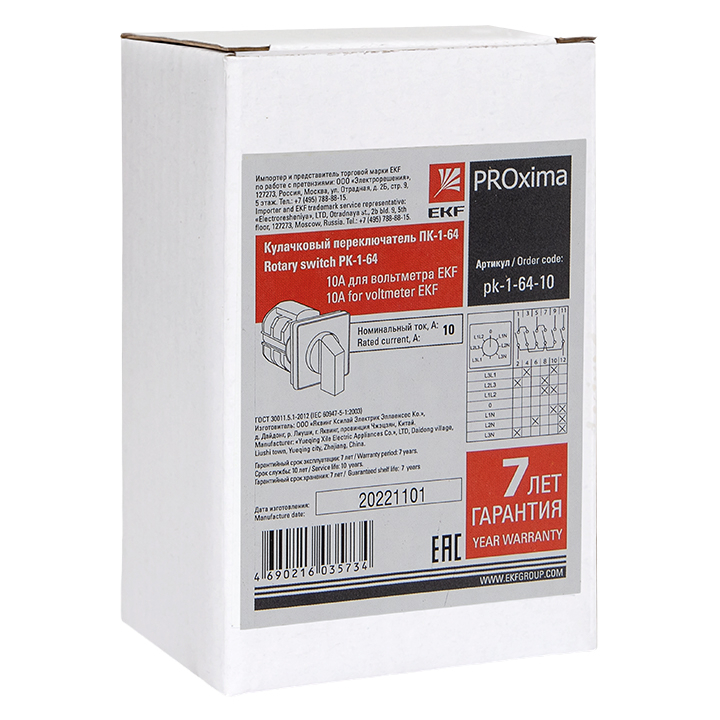 Переключатель кулачковый EKF PROxima ПК-1-64 реализуется в индивидуальной упаковке.