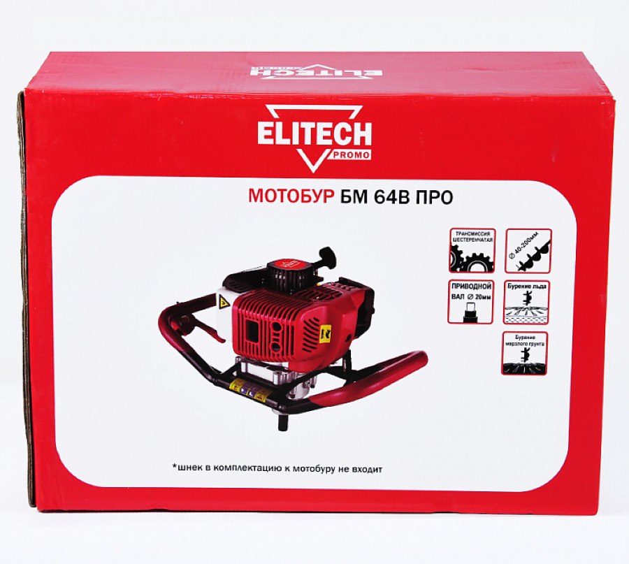 Полупрозрачный топливный бак позволяет контролировать уровень смеси во время процесса. Конструкция мотобура бензинового Elitech БМ 64В ПРО предусматривает присоединение шнеков разного диаметра до 200 мм, что обеспечивает универсальность даже при работе с мерзлой землей или льдом.