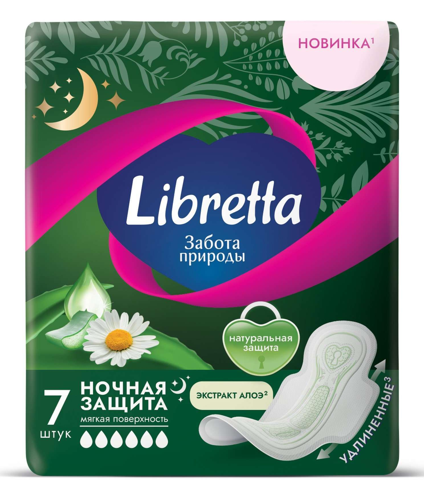Прокладки с мягкой дышащей поверхностью и ароматом ромашки созданы для натуральной заботы о коже в интимной зоне, так как обогащены экстрактом алоэ. Благодаря анатомической форме прокладка плотно прилегает к телу и надежно защищает от протеканий ночью.