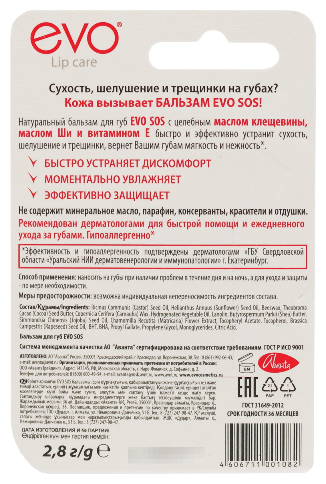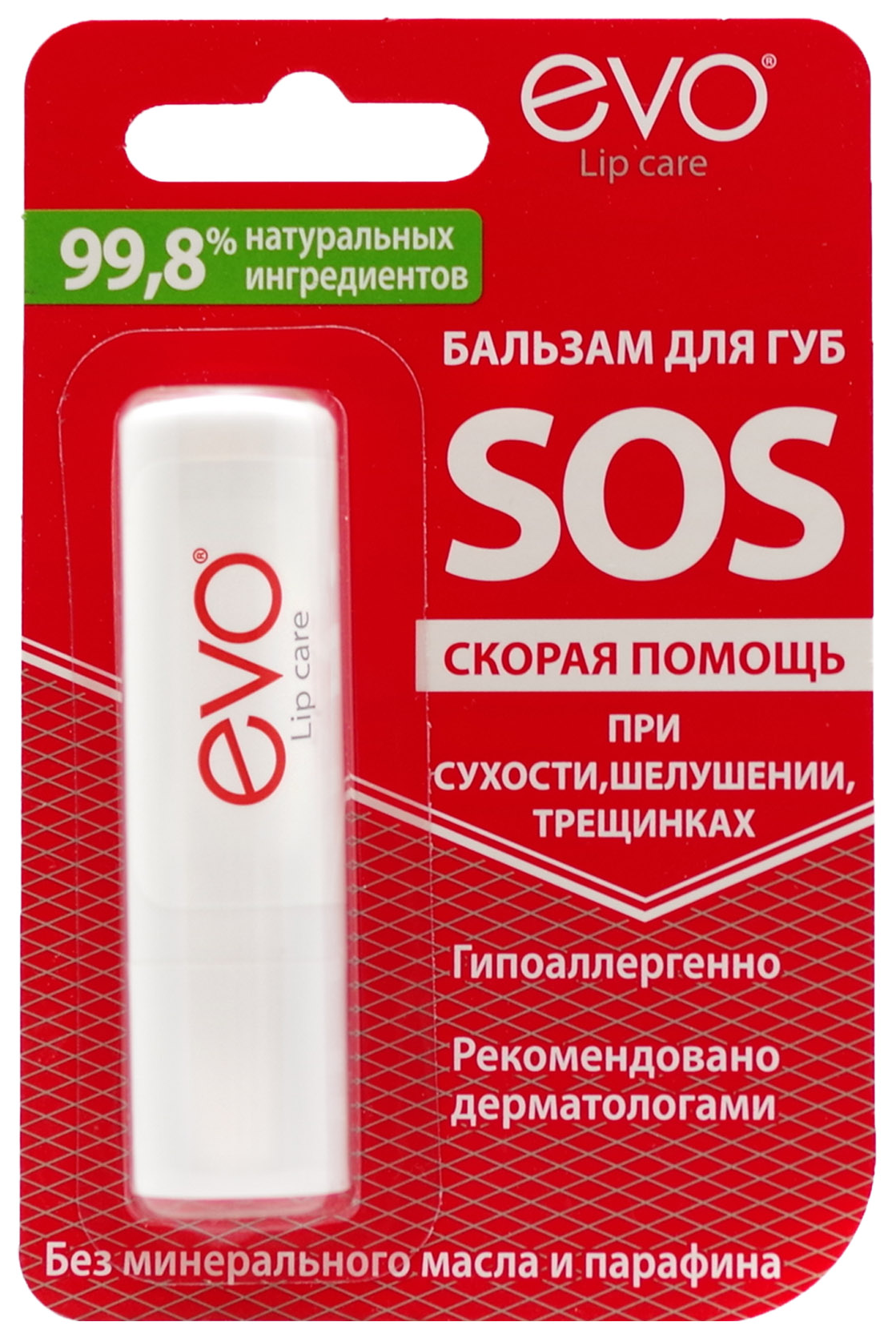 Натуральный бальзам для губ Evo SOS с целебным маслом клещевины, маслом Ши и витамином Е быстро и эффективно устранит сухость, шелушение и трещинки, вернет Вашим губам мягкость и нежность.