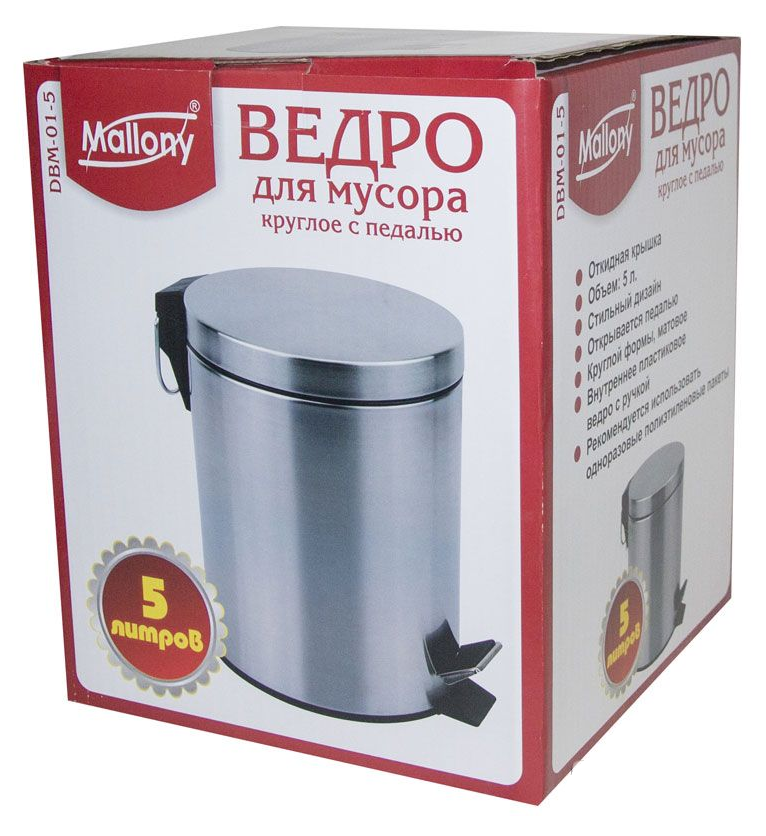 Ведро Mallony / Маллони DBM-01-5 хозяйственное, круглое, из нержавеющей стали, 5л / товары для дома