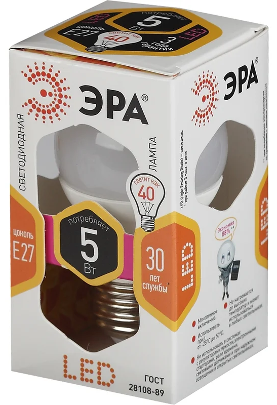 Лампа ЭРА является аналогом лампы накаливания. Она экономичнее, надежнее при той же яркости. Имеет длительный срок службы. Почти не нагревается. Стабильно работает при колебаниях напряжения питания.
