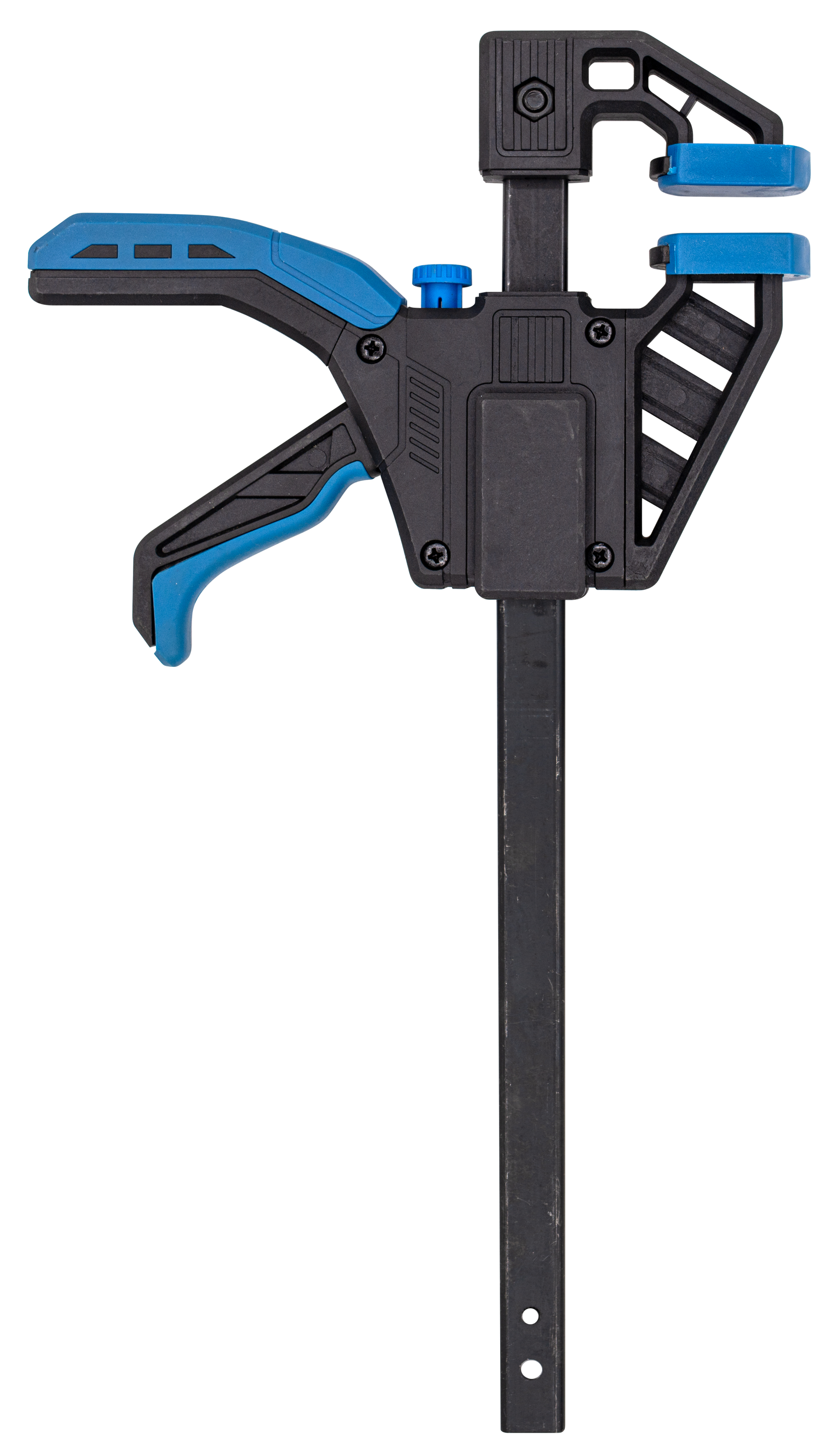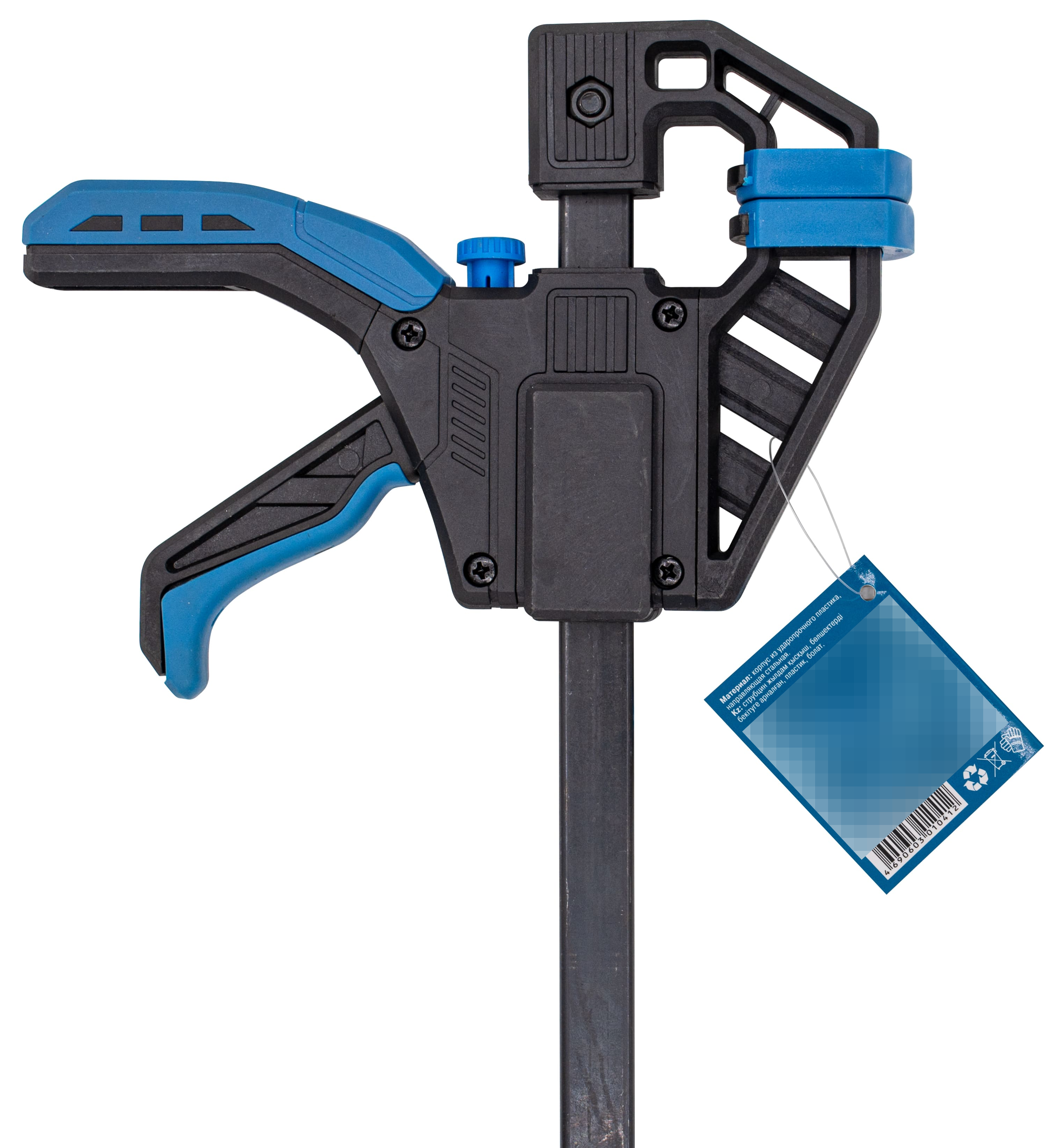 Шина струбцины — сталь холоднотянутая. Защитное покрытие шины — оксидирование. Механизм прижимной части — комбинированный (пластик+металл+резина). Пластиковая накладка на прижимную губку. Используется при строительных и ремонтных работах. Оснащена быстрозажимным механизмом. Рукоятка имеет пистолетную форму, что очень удобно, и выполнена из высококачественной пластмассы.