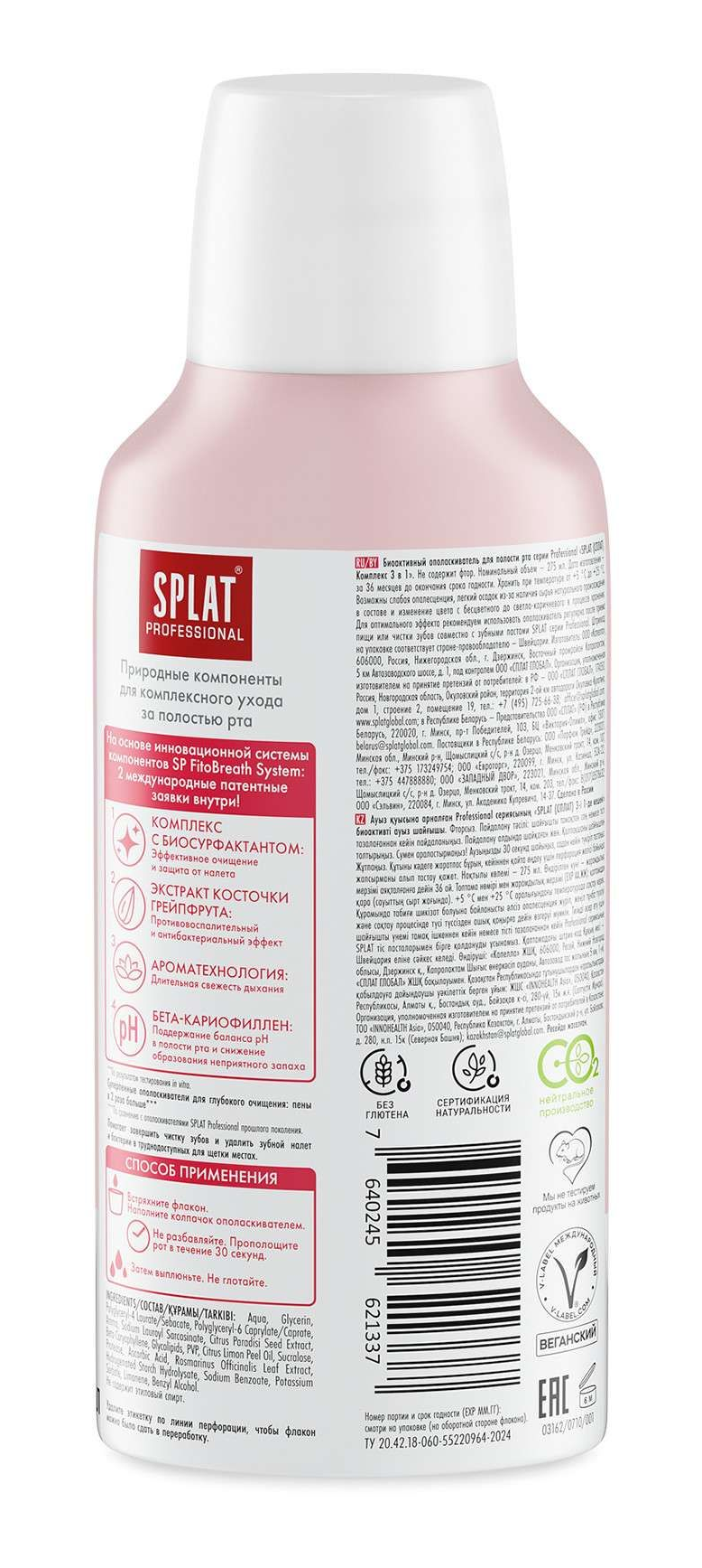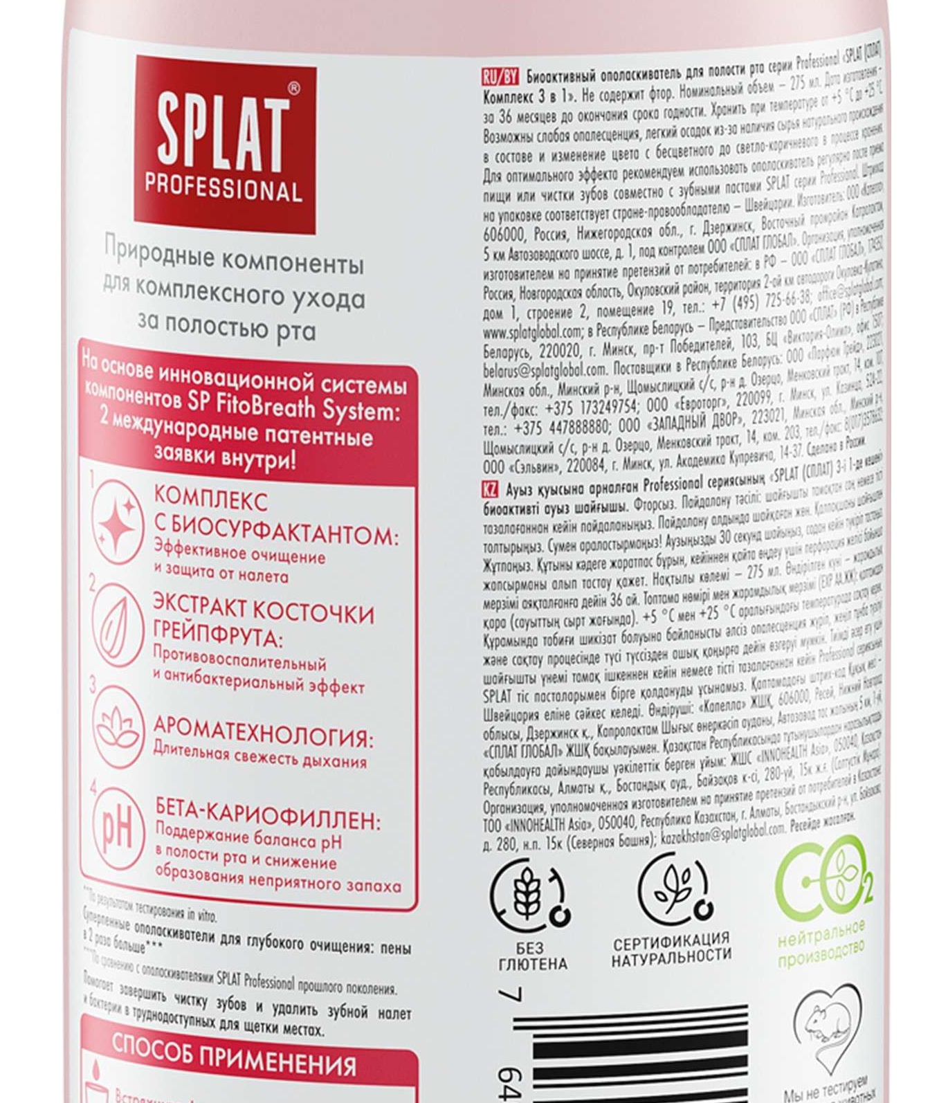 Ополаскиватель для полости рта SPLAT Professional содержит систему активов SP. FitoBreath System, что включает в себя комбинацию специальных ПАВ. Эта комбинация создает пену для эффективного очищения от налета и остатков пищи, тем самым эффективно предотвращая рост кариесогенных бактерий, а также поддерживает здоровье десен и пролонгирует свежее дыхание и чистоту зубов. Активы в SP. Fitobreath System также отвечают и за долгое сохранение свежести дыхания, противовоспалительный эффект и поддержания баланса pH в полости рта, тем самым улучшая гигиену.