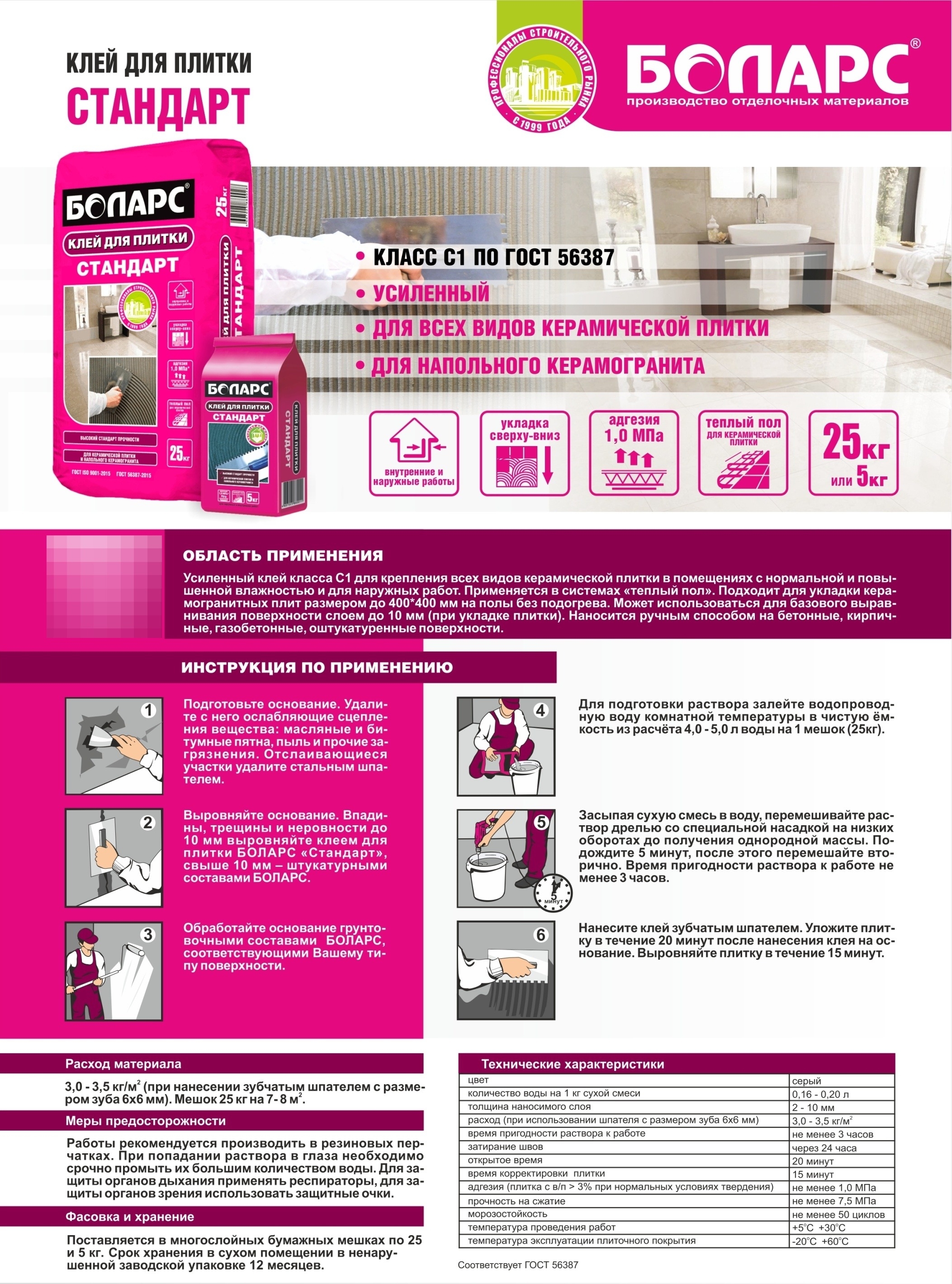 Ищете надежное решение для облицовочных работ? Клей Боларс Стандарт создан для фиксации керамогранита и различных видов керамической плитки. Состав демонстрирует превосходную эластичность и полную водонепроницаемость после затвердевания.