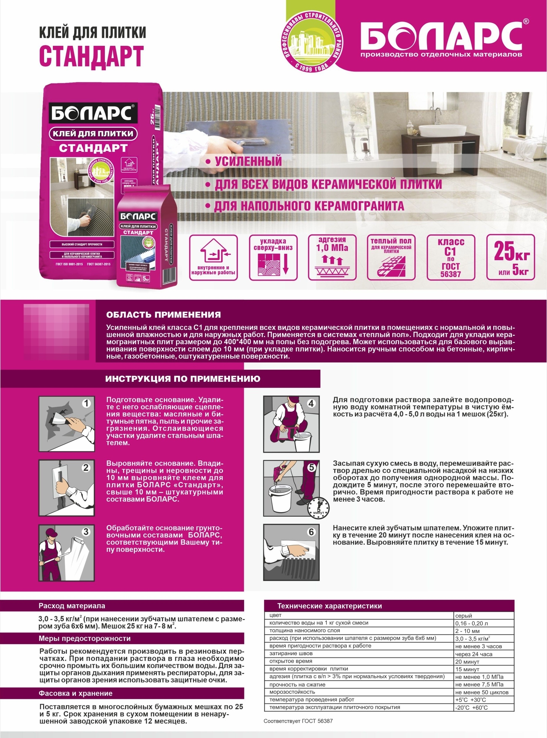 Ищете надежное решение для облицовочных работ? Клей Боларс Стандарт создан для фиксации керамогранита и различных видов керамической плитки. Состав демонстрирует превосходную эластичность и полную водонепроницаемость после затвердевания.