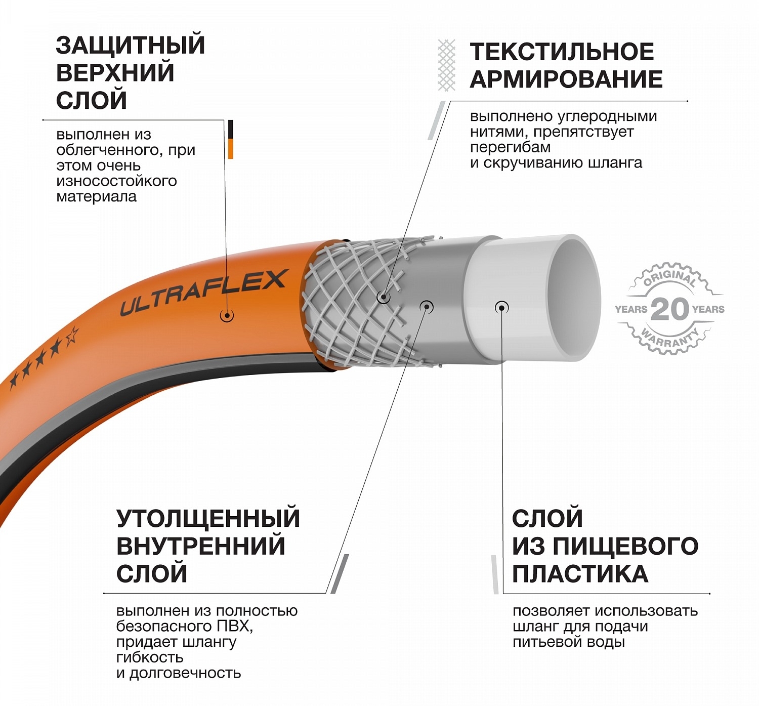 Специальные материалы, из которых изготовлен шланг, делают его очень гибким, легким и приятным на ощупь. Шланг легко укладывается и не перекручивается. 4 слоя из высококачественных материалов делают шланг устойчивым к давлению на разрыв до 25 бар, долговечным и износостойким. Шланг отлично противостоит перегибам и скручиванию, благодаря высококачественному перекрестному текстильному армированию. Материалы, из которых изготовлен шланг, не содержат токсичных фталатов и тяжелых металлов. Шланг имеет специальное покрытие, которое защищает его от воздействия УФ и низких температур, что позволит хранить его на улице или в неотапливаемом помещении. Допустимый диапазон температур от -10° до 60°.