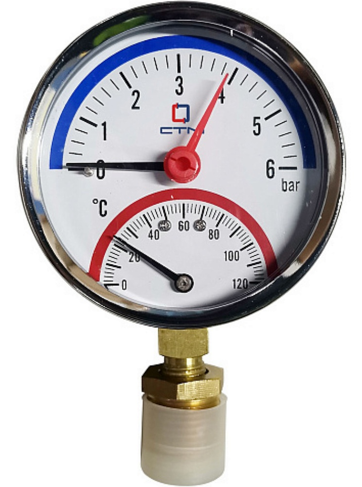 Термо-манометр СТМ14R06 радиального подключения ¼», измерение до 6 бар, до +120° С предназначен для индикации температуры и давления на бытовых системах отопления и водоснабжения.