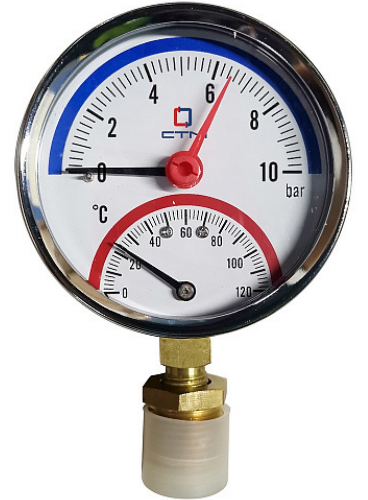 Термо-манометр СТМ14R10 радиального подключения ¼», измерение до 10 бар, до +120° С предназначен для индикации температуры и давления на бытовых системах отопления и водоснабжения.
