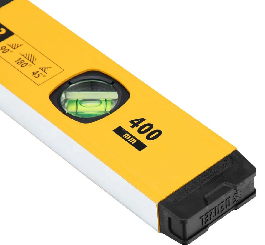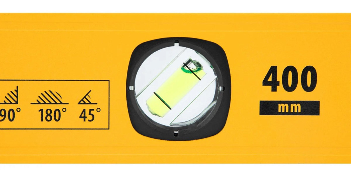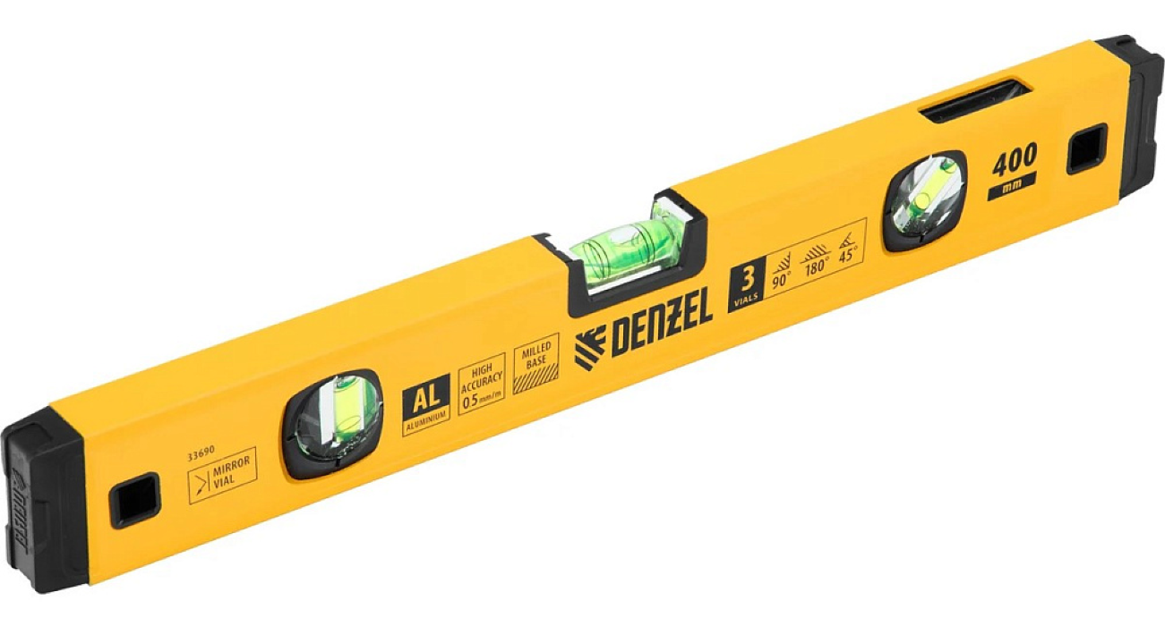 Алюминиевый фрезерованный уровень Denzel длиной 400 мм, с магнитом и 3 глазками, из которых 1 зеркальный, предназначен для контроля отклонений от горизонтальной, вертикальной и поверхности под углом 45° с точностью 0, 5 мм/м. 3 пузырьковые камеры 90°, 180° и 45° позволяют быстро проверить правильность разметки. Инструмент незаменим при проведении строительных, ремонтных, сантехнических работ.