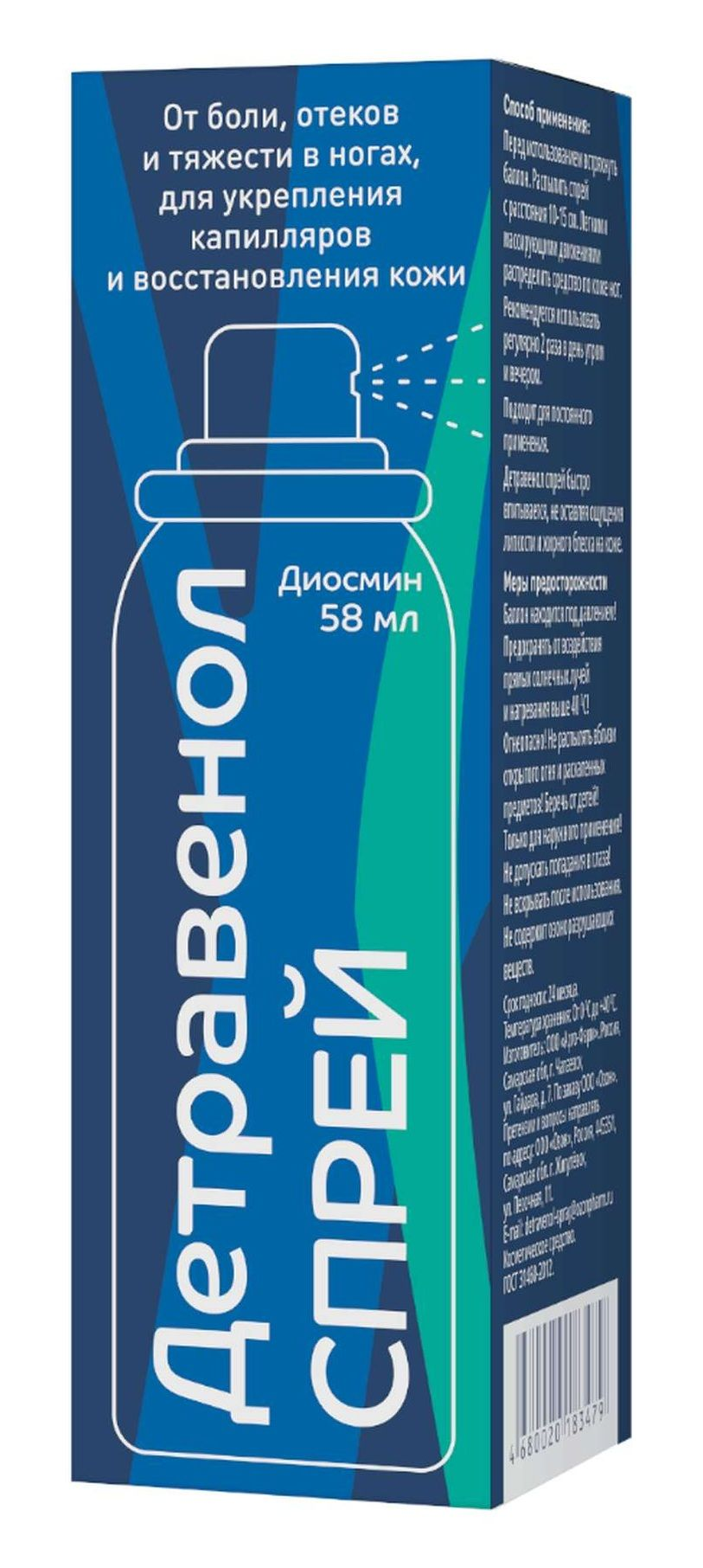 Спрей для ног Детравенол содержит в своем составе диосмин природного происхождения. Он активизирует кровообращение, повышает тонус вен и снижает отёчность. Ментол улучшает состояние сосудов, оказывая венотонизирующее и освежающее действие.