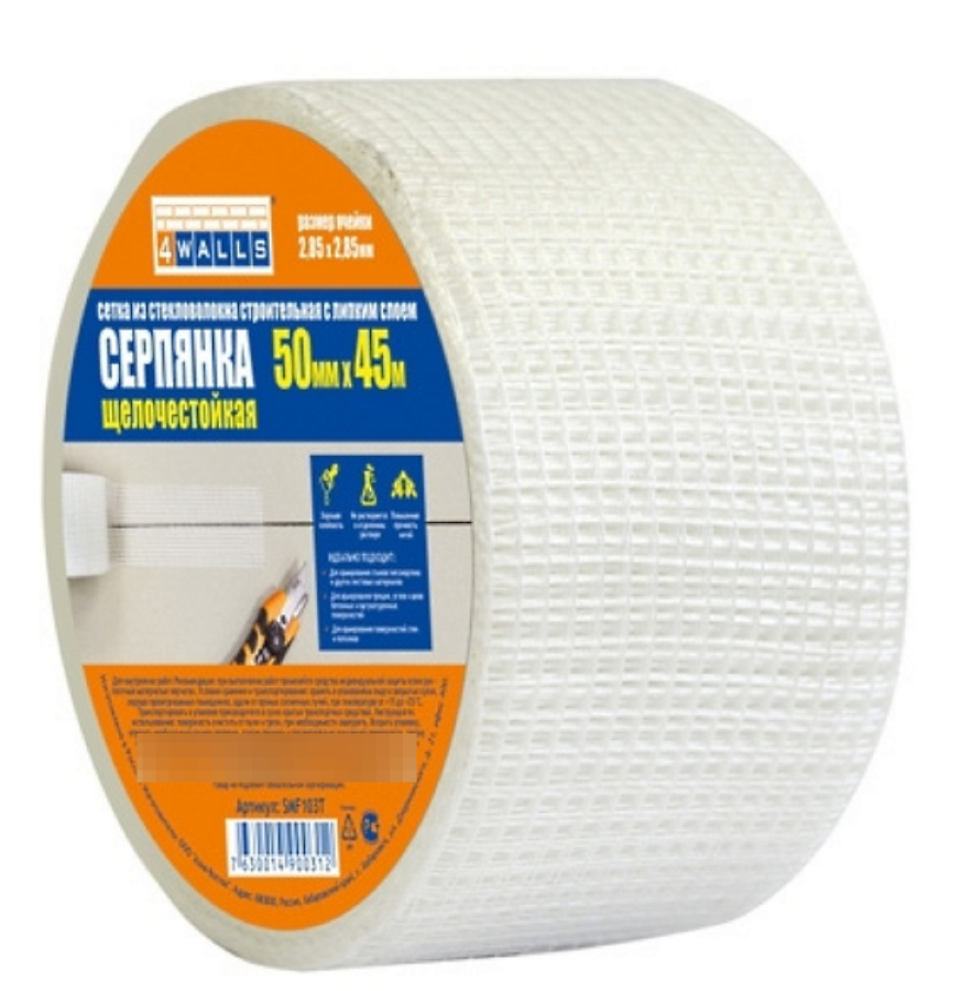 Самоклеящаяся серпянка 4Walls Серпянка — это универсальный строительный материал шириной 50 мм, предназначенный для укрепления строительных смесей. Сетчатая структура препятствует образованию воздушной прослойки и обеспечивает идеальное сцепление с раствором.
