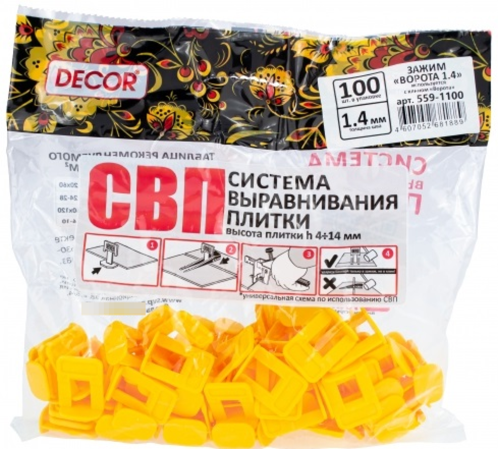 Зажим для выравнивания плитки DECOR Ворота, пластиковый, желтый, 1.4мм, 100шт. - 1 упаковка