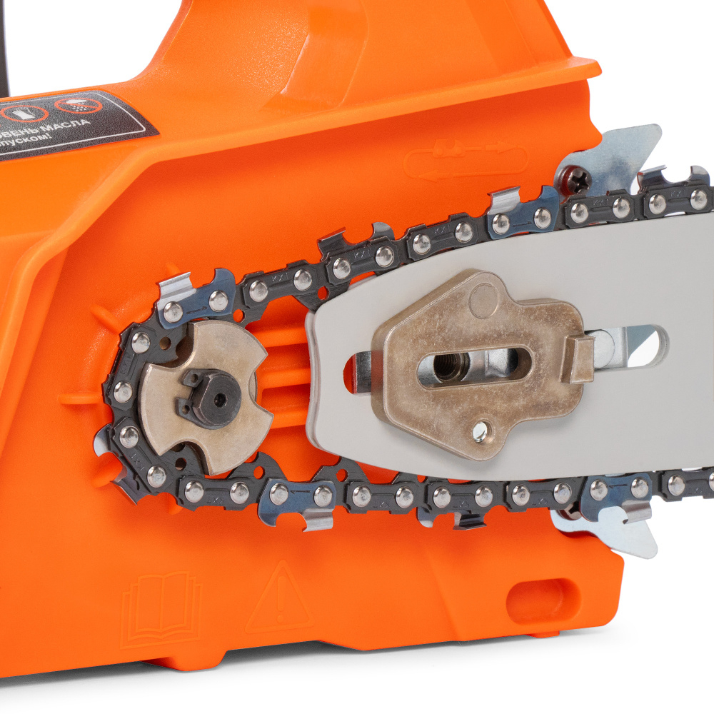 Пила компактная, весит немного, что делает ее удобной для продолжительной работы. Выполнена в прочном корпусе. Цвет — оранжевый. Длина полотна — 300 мм. Шаг цепи — 3/8 дюйма. Количество звеньев — 45 шт.