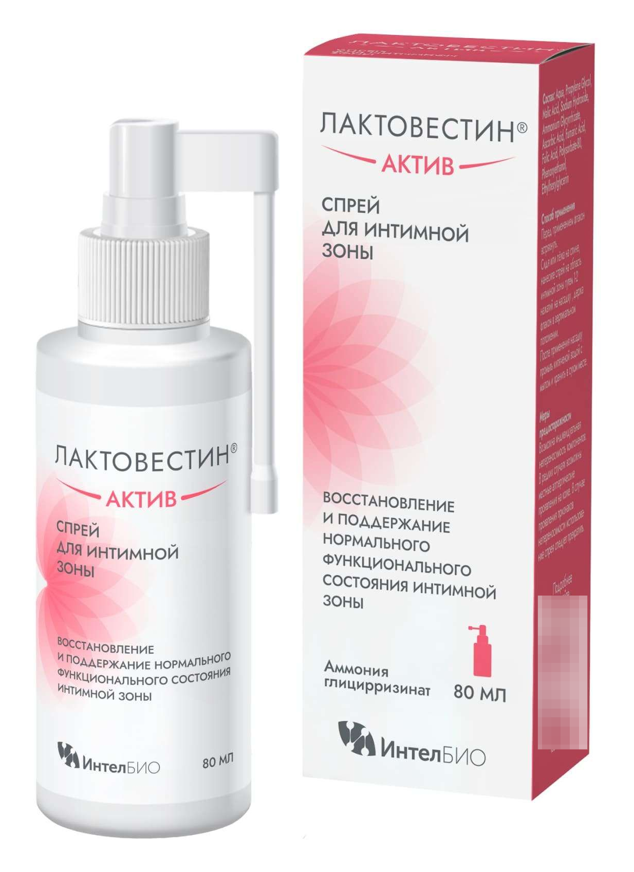 Интимный спрей ИнтелБИО реализуется в индивидуальной упаковке. Объем — 80 мл. В своем составе содержит следующие компоненты: Aqua, Propylene Glycol Malic Acid, Sodium Hydroxide Ammonium Glycyrrhizate Ascorbic Acid, Fumaric Acid, Folic Acid, Polysorbate-80, Phenoxyethanol, Ethylhexylglycerin.