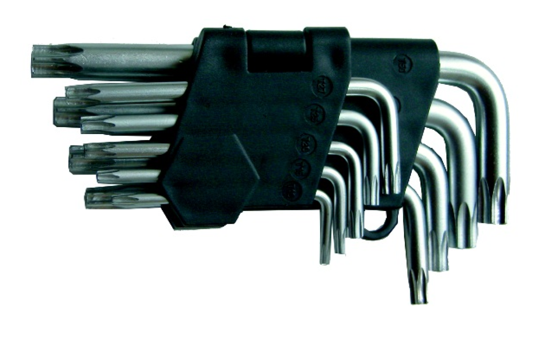 Комплект предназначен для работы с соединениями с шлицем TORX. Пластиковый держатель удобен для хранения ключей. Г-образная форма инструмента обеспечивает большой крутящий момент.