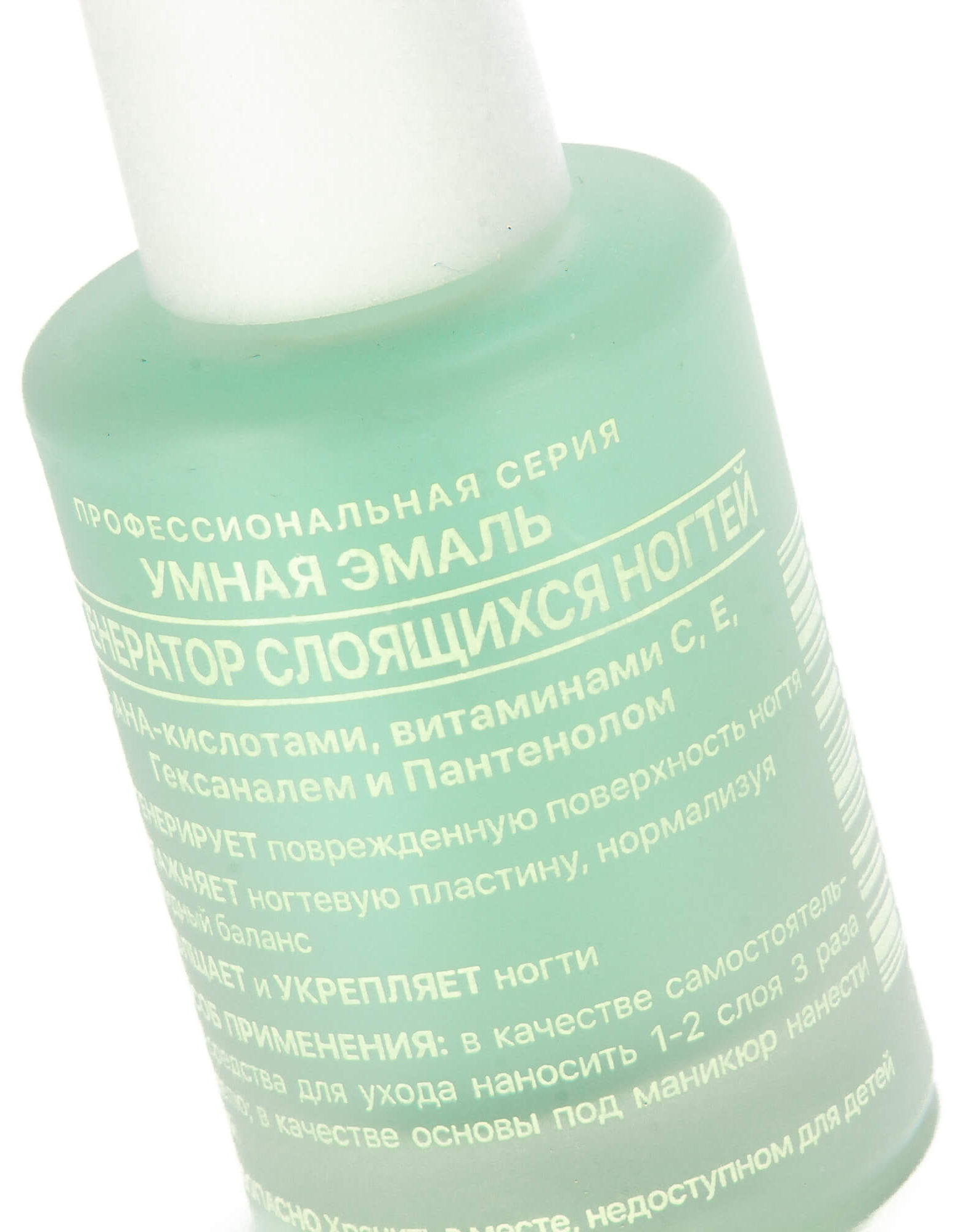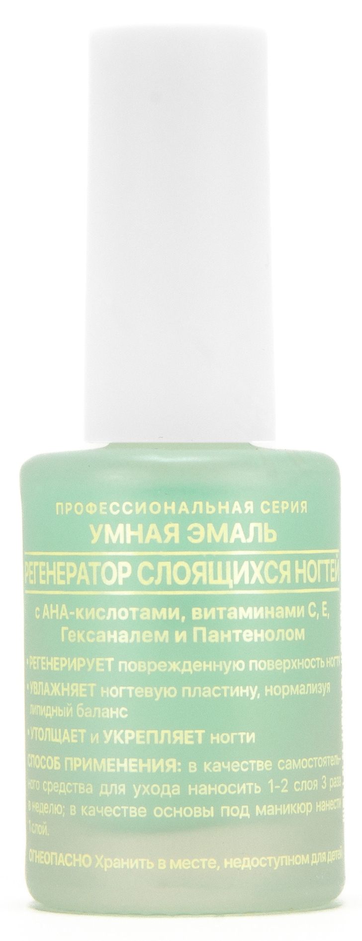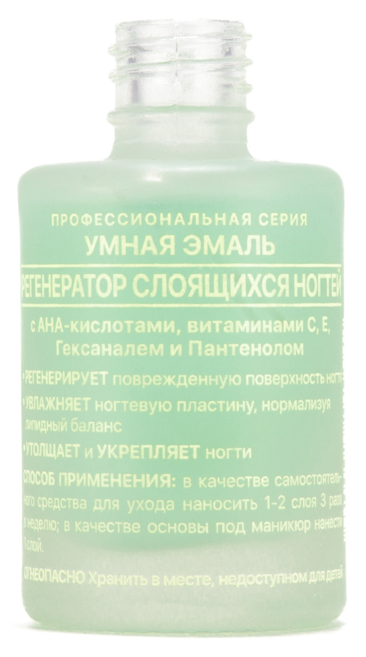 Умная Эмаль Регенератор слоящихся ногтей — лак для ногтей с AHA кислотами, витаминами С, E, гексаналем и пантенолом регенерирует поврежденную поверхность ногтя, увлажняет ногтевую пластину, нормализуя липидный баланс, а также утолщает и укрепляет ногти.