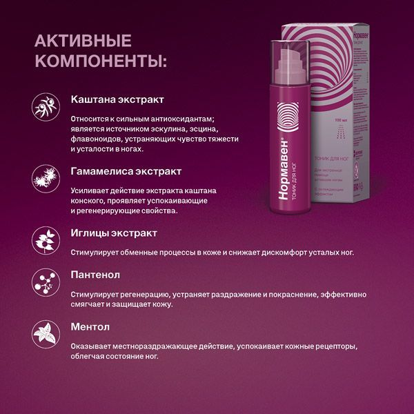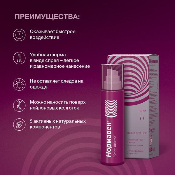 НОРМАВЕН спрей — тоник оказывает мгновенное охлаждающее действие, возвращая ногам ощущение легкости и комфорта. Оказывает венотонизирующее действие, способствует значительному уменьшению отеков. Продукт разработан специально для ухода за ногами вне дома, удобная форма выпуска позволяет нанести средство в любых условиях: на работе, в офисе, во время перелетов и дальних поездок.