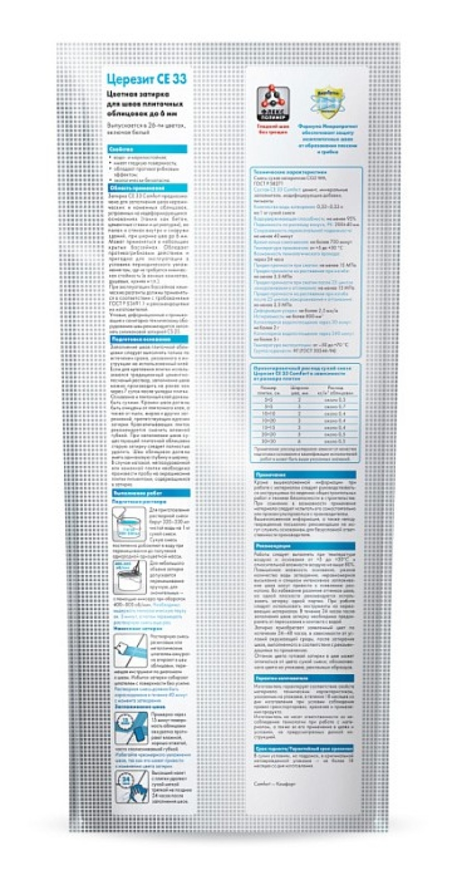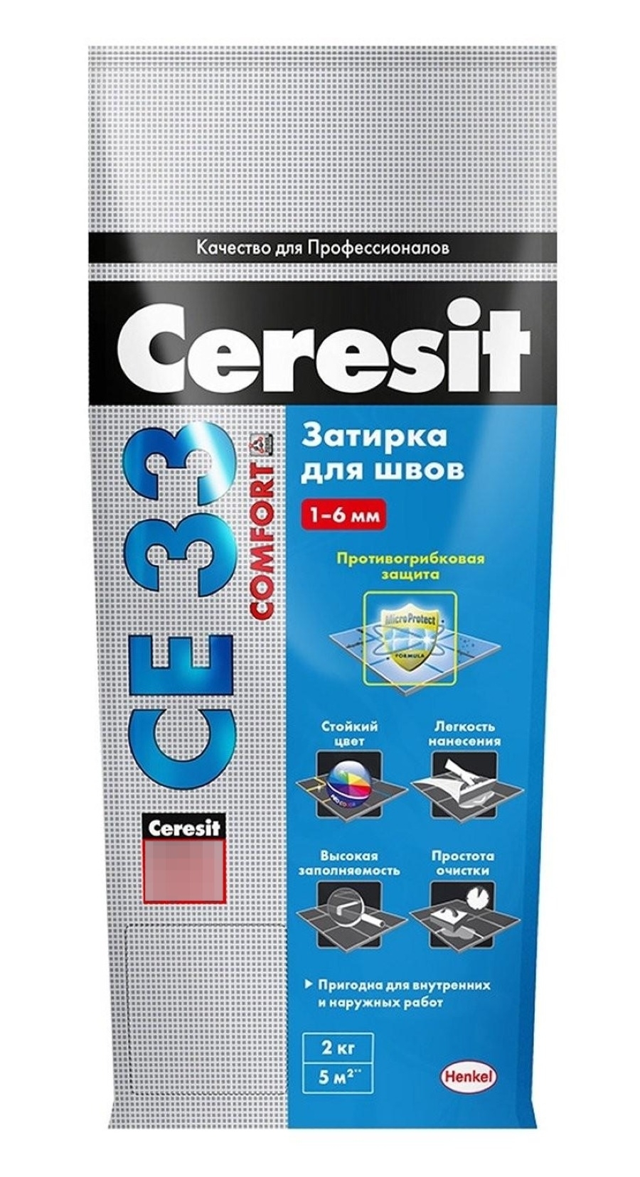 Затирка Ceresit СЕ33 Comfort предназначена для заполнения швов керамических и каменных облицовок, устроенных на недеформирующихся основаниях (таких как бетон, цементные стяжки и штукатурки), на полах и стенах внутри и снаружи зданий, при ширине шва до 6 мм.