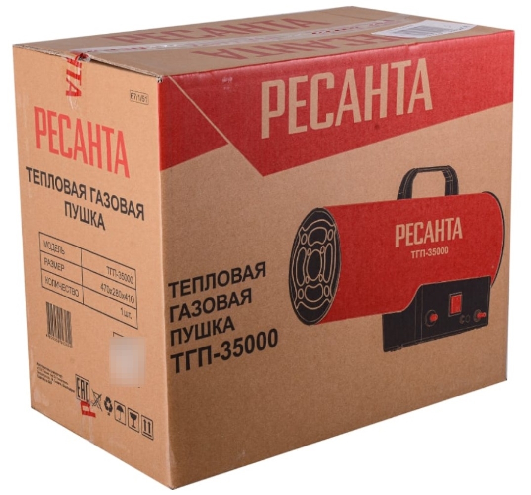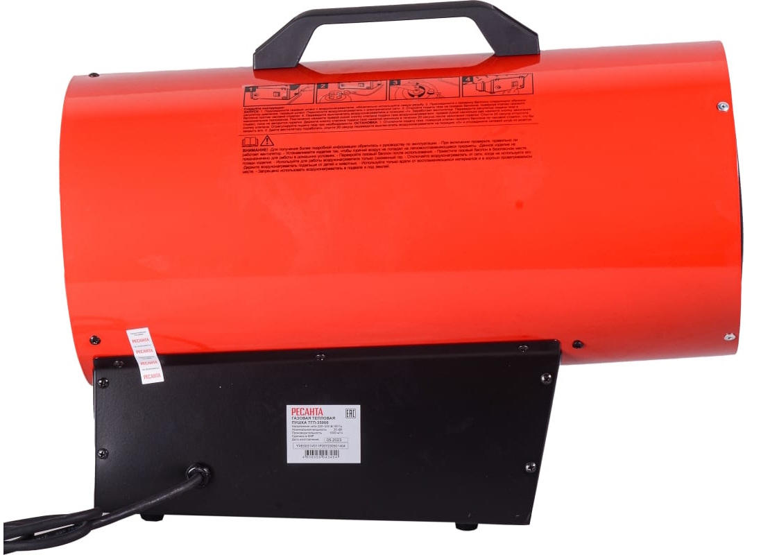 Тепловая газовая пушка Ресанта реализуется в индивидуальной упаковке. Выполнена в стальном корпусе. Цвет — красный. Размер — 500х360х250 мм.